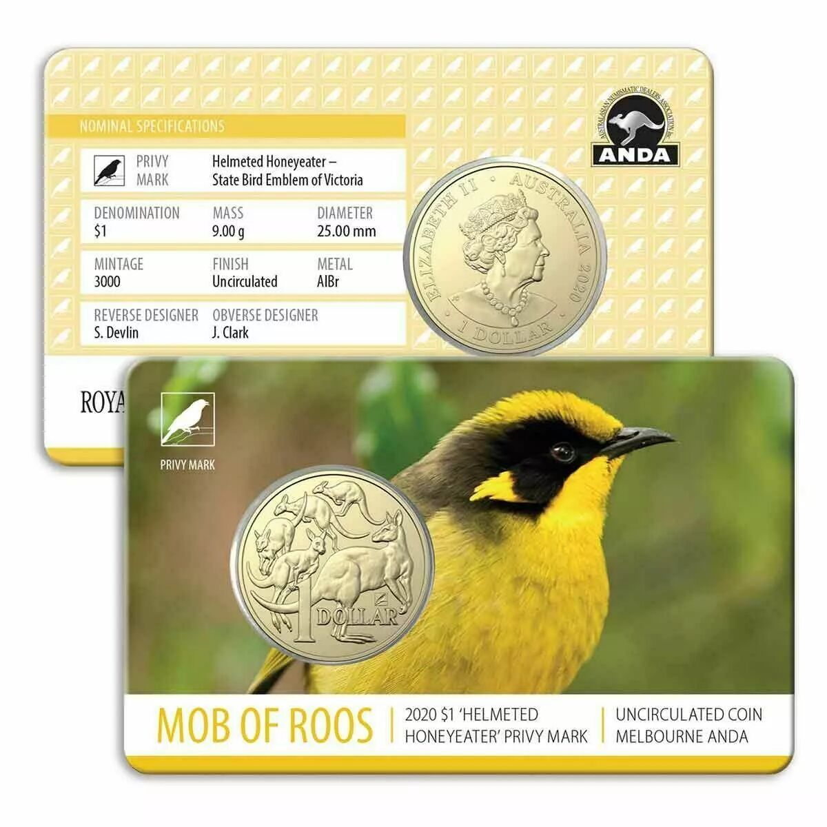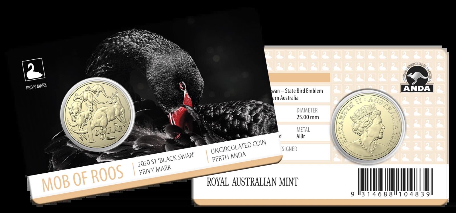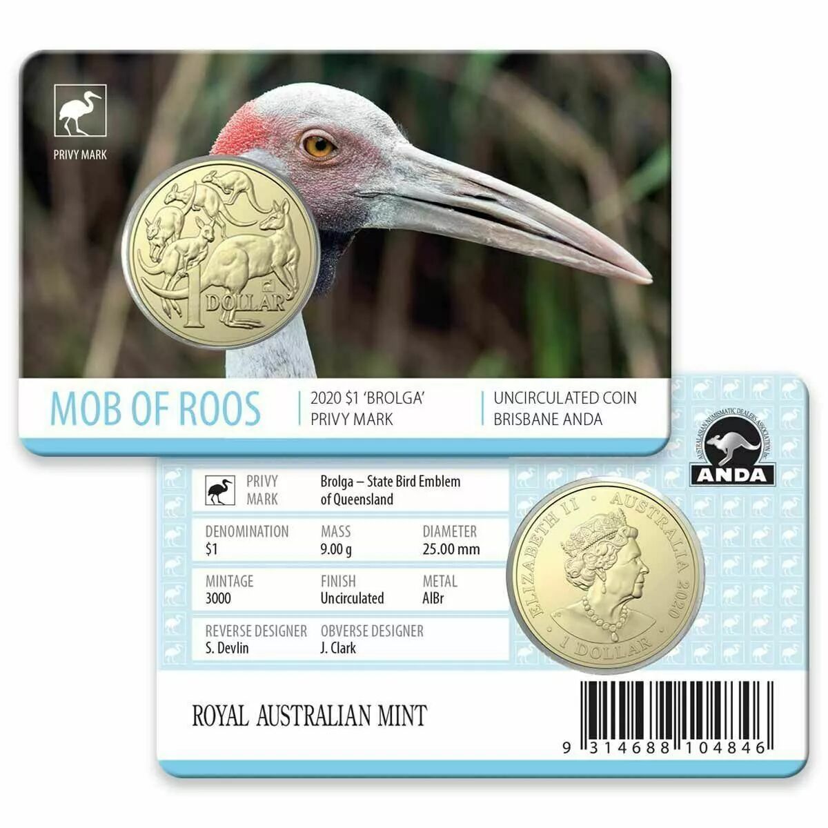 ANDA 2020 $1 Privy Mark Coins - Black Swan, Brolga, Honeyeater & Kookaburra In Folder #26