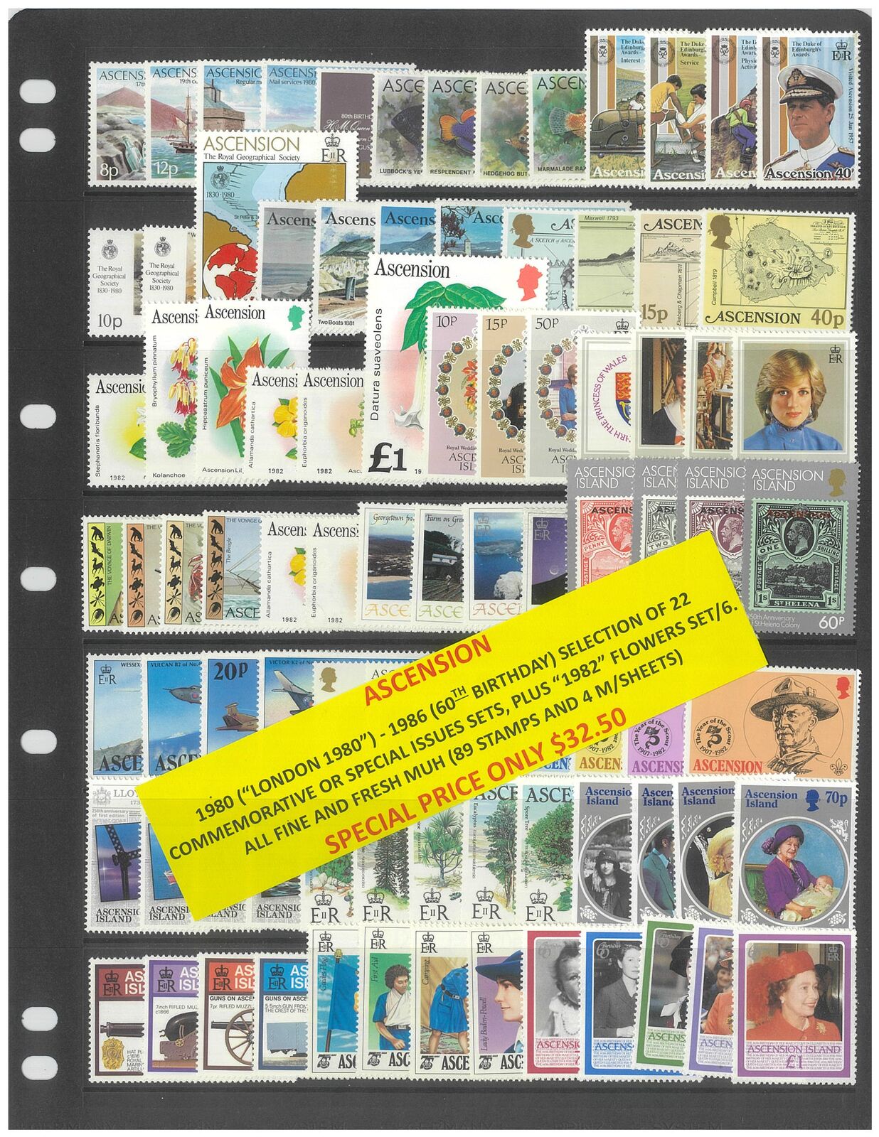 Ascension 1980-86 Selection of 22 Commemorative Sets, plus 1982 Flowers set of 6. 89 Stamps & 4 Mini Sheets MUH #290