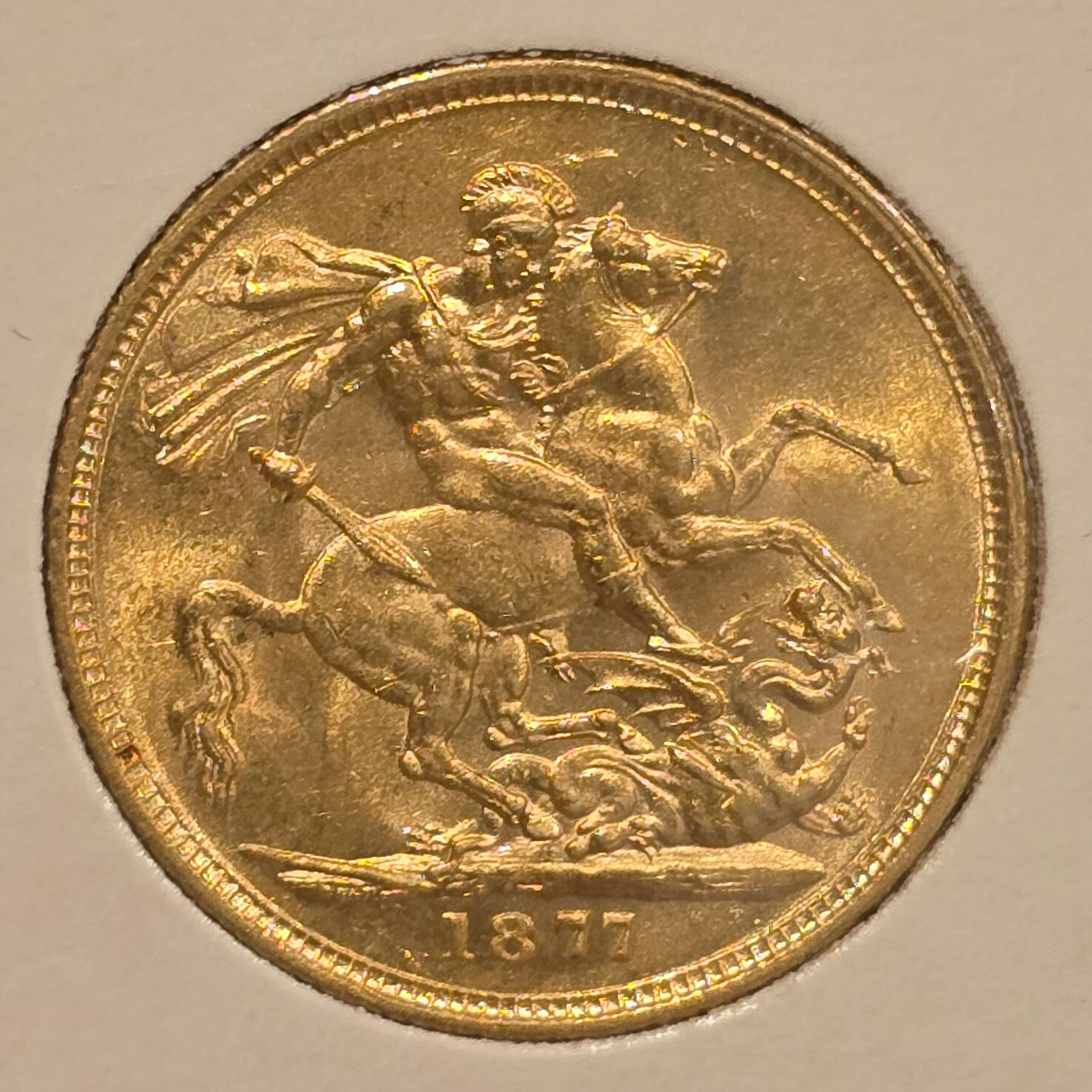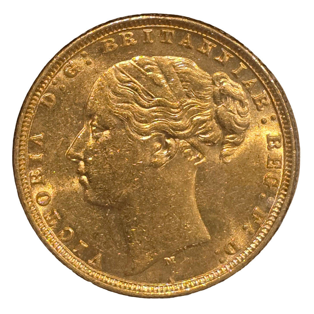 A bright and sharply struck 1877‑M St George Sovereign, minted at the Melbourne Mint during the early years of its gold sovereign production. The 1877‑M issue is a desirable early Melbourne‑mint sovereign, combining the classic Benedetto Pistrucci St George & the Dragon reverse with the elegant Young Head portrait of Queen Victoria.
