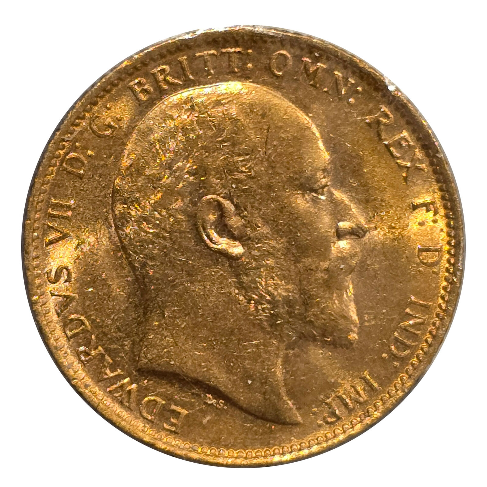 Obverse: Bold portrait of King Edward VII by George William de Saulles, with crisp hair and beard detail and smooth, satiny fields.