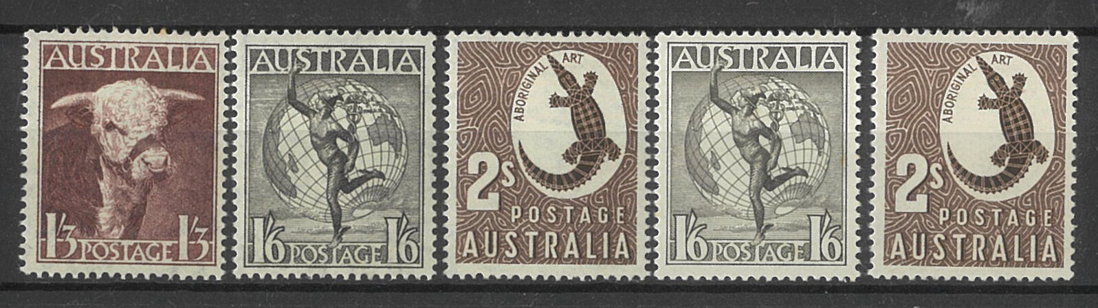 Australia 1948-56 1/3 Bull, 1/6 Hermes, 2/- Aboriginal Art with watermark Set/3 stamps and No WMK 1/6 & 2/- stamps, SG223/24, 224e/24f. MUH (5 values)