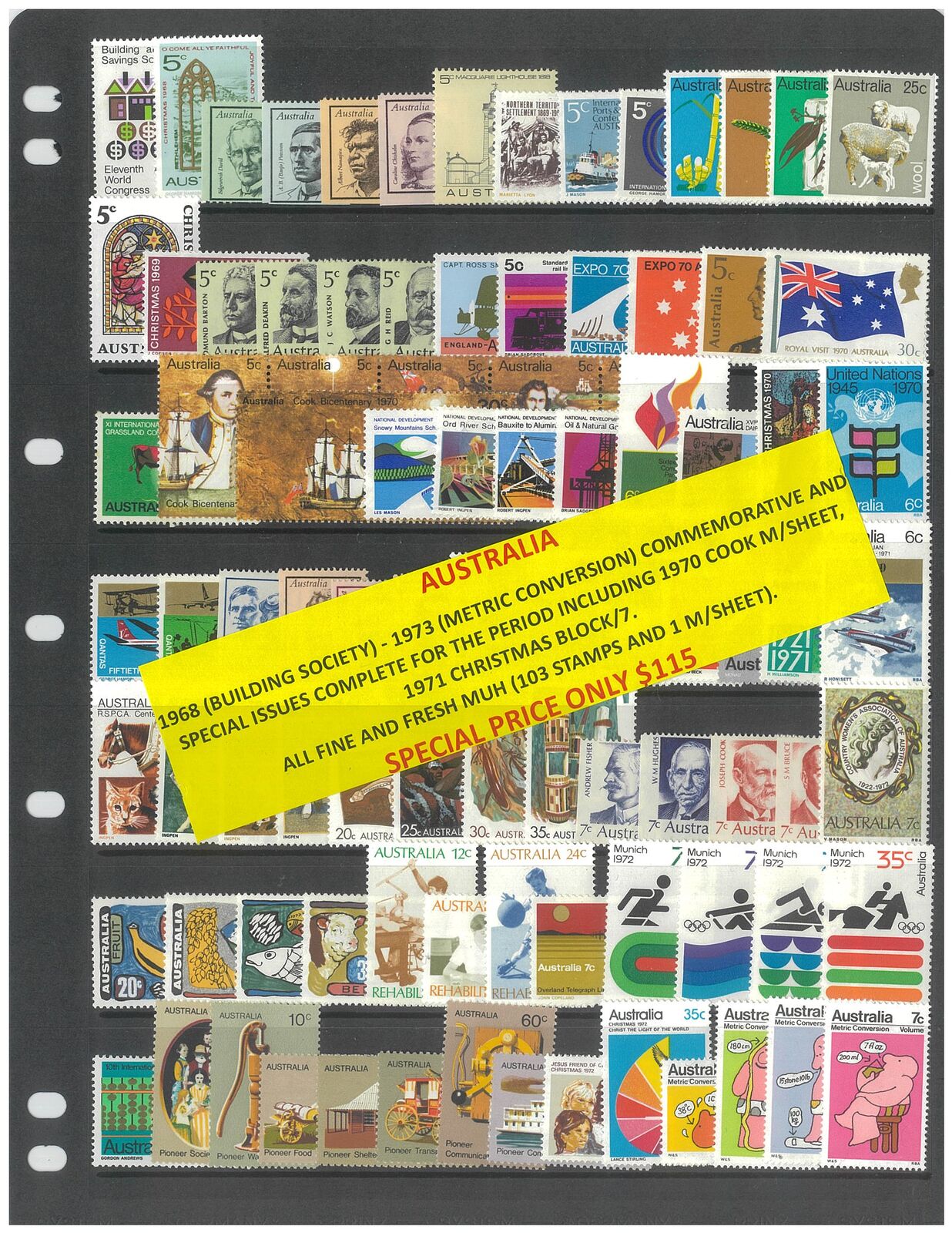 Australia 1968-73 Commemorative Complete Issues, including 1970 Cook mini sheet, 1971 Christmas block of 7. 103 Stamps & 1 Mini Sheet MUH #269