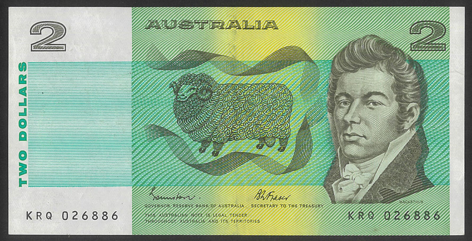 Australia 1985 $2 Banknote Johnston/Fraser R89F 1st Prefix KRQ gVF #2-40