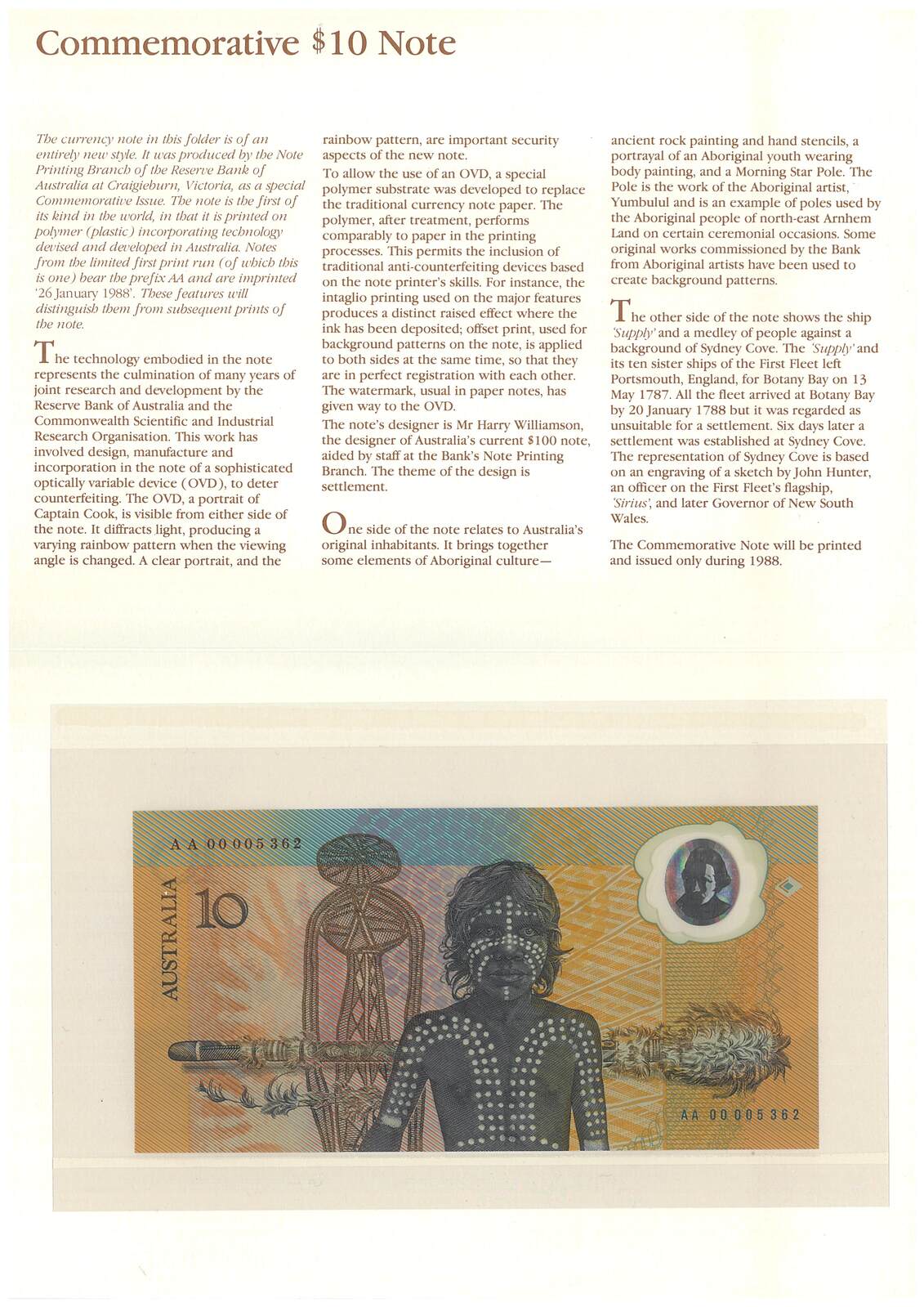 Australia 1988 First Polymer $10 Banknote AA00 Prefix UNC in Folder