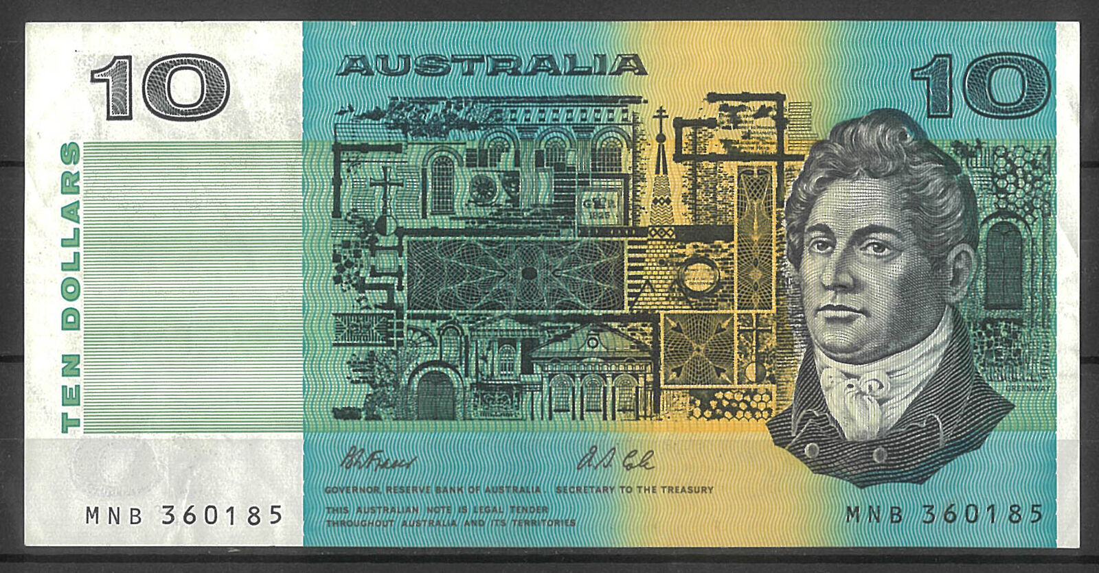 Australia 1991 $10 Banknote Fraser/Cole No Plate Letter 1st Prefix MNB R313bF gFine #4-35