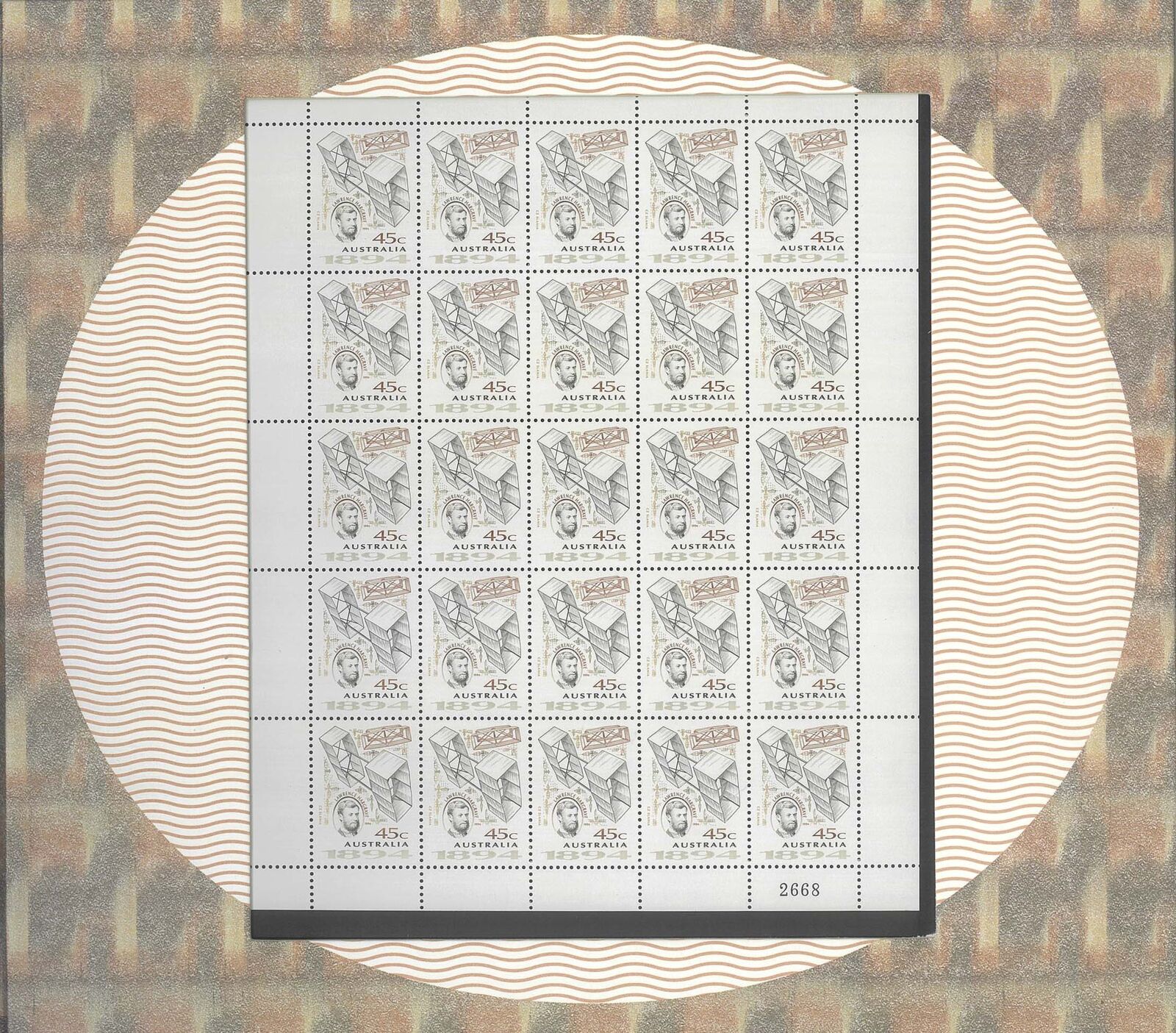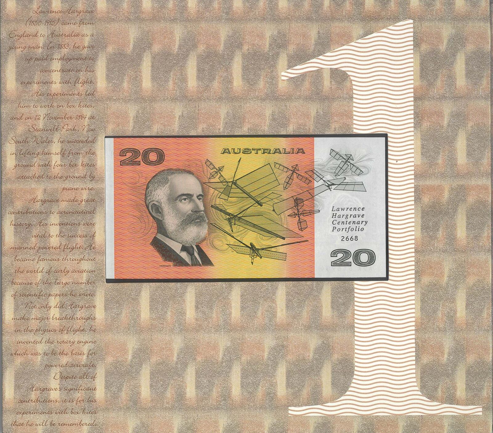 Issued by Note Printing Australia to commemorate the Centenary of Lawrence Hargrave’s pioneering aviation experiments, this official 1994 portfolio brings together a $20 polymer banknote and a matching pane of 25 Australia Post stamps celebrating Hargrave’s contributions to early flight.