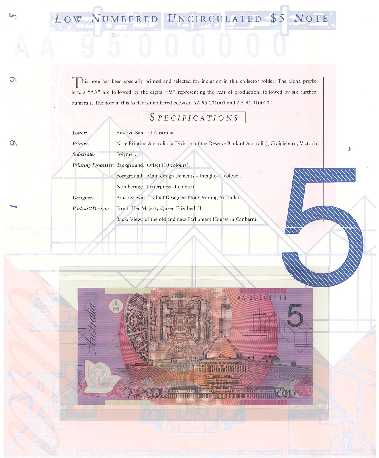Australia 1995 $5 Deluxe NPA Folder Low Numbered UNC
