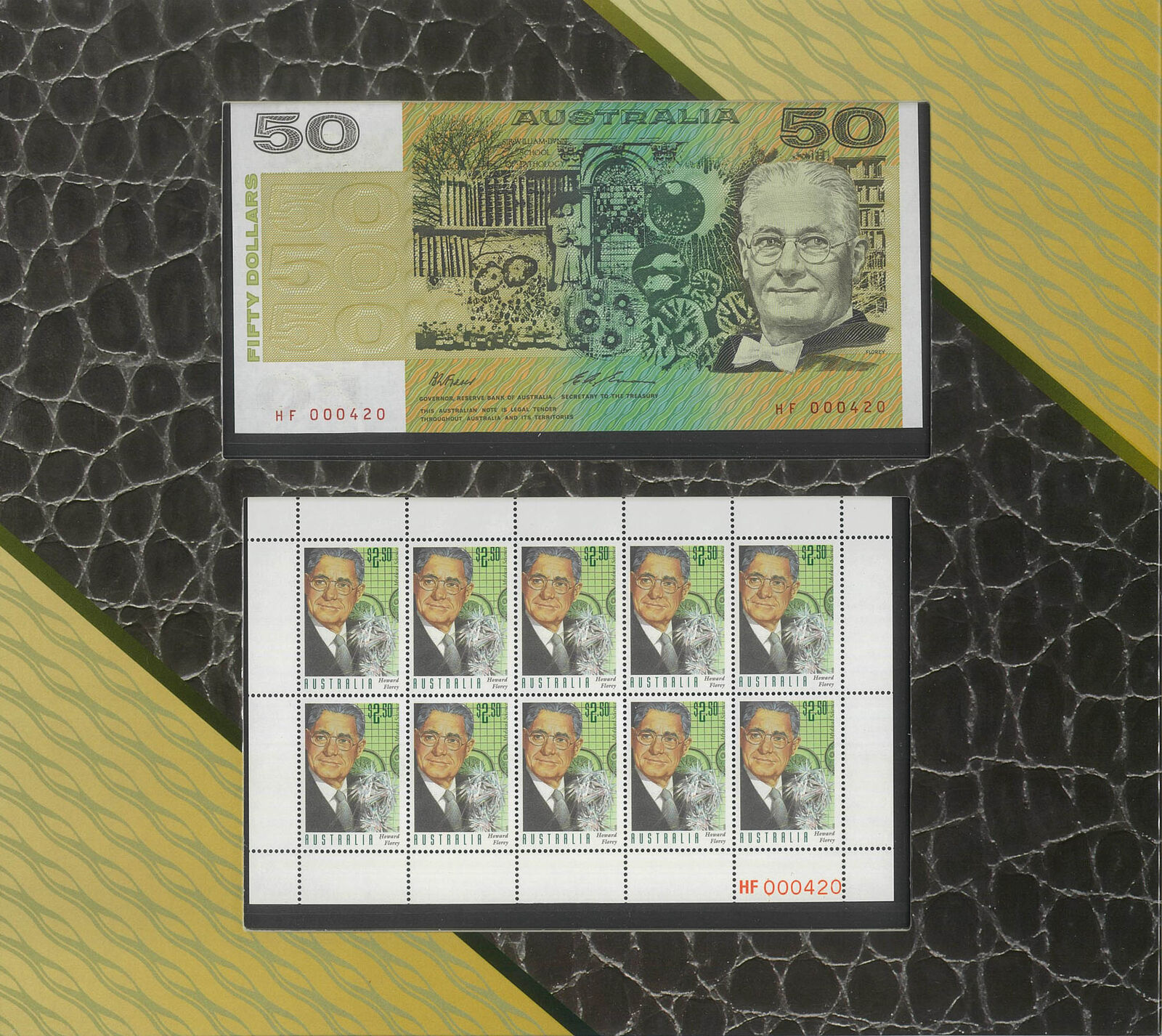 A popular commemorative release honouring Sir Howard Florey, the Australian Nobel Prize–winning scientist whose work on penicillin transformed modern medicine. This 1995 Portfolio pairs a $50 polymer banknote with a matching sheet of 10 Australia Post stamps, all presented in the official Note Printing Australia (NPA) folder.