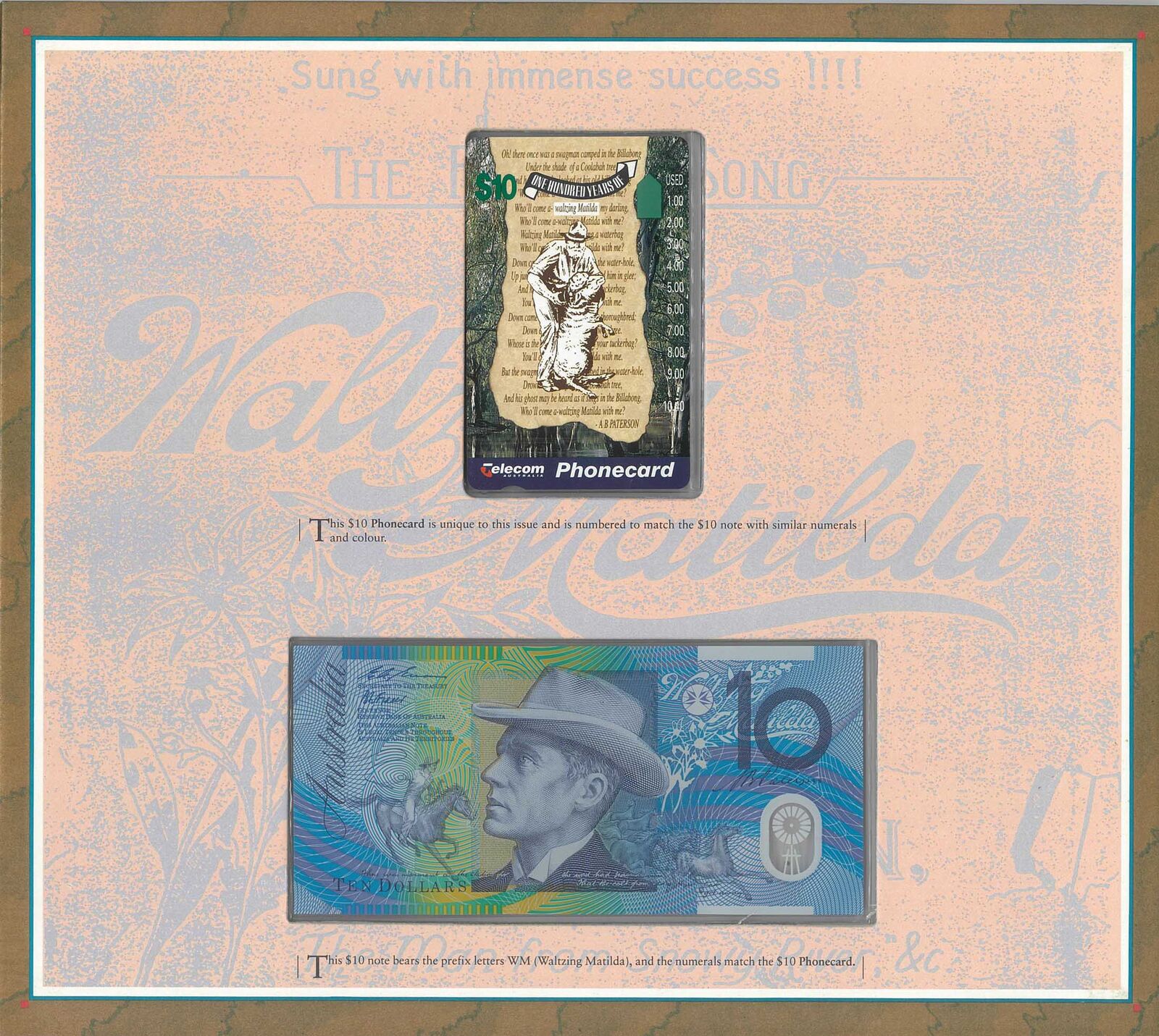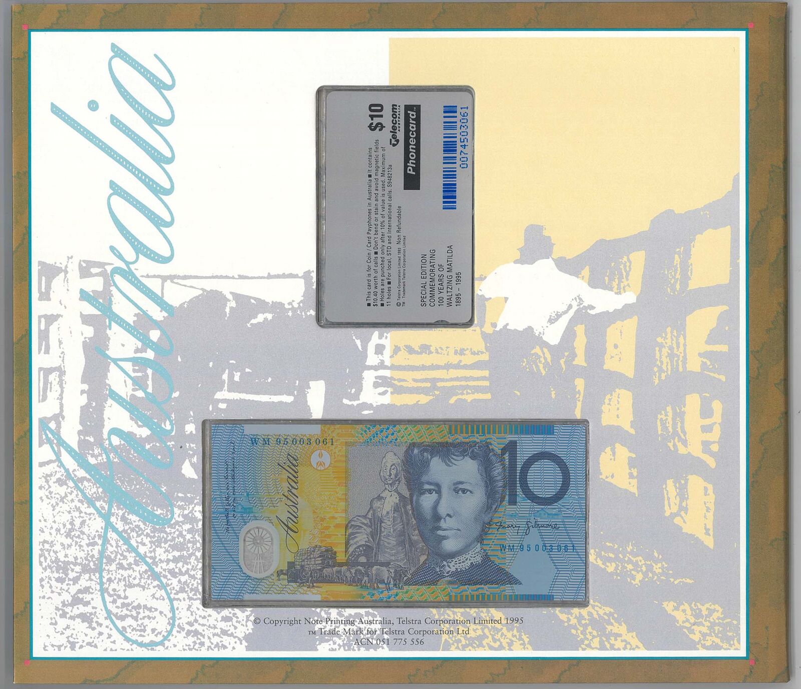 A popular commemorative release celebrating Australia’s most iconic bush ballad, this 1995 Waltzing Matilda Portfolio pairs a $10 polymer banknote with a matching $10 Telecom phonecard, both presented in the official Note Printing Australia (NPA) folder. The set was issued to mark the centenary of Banjo Paterson’s timeless work and remains a sought‑after collectible across both numismatic and phonecard communities.