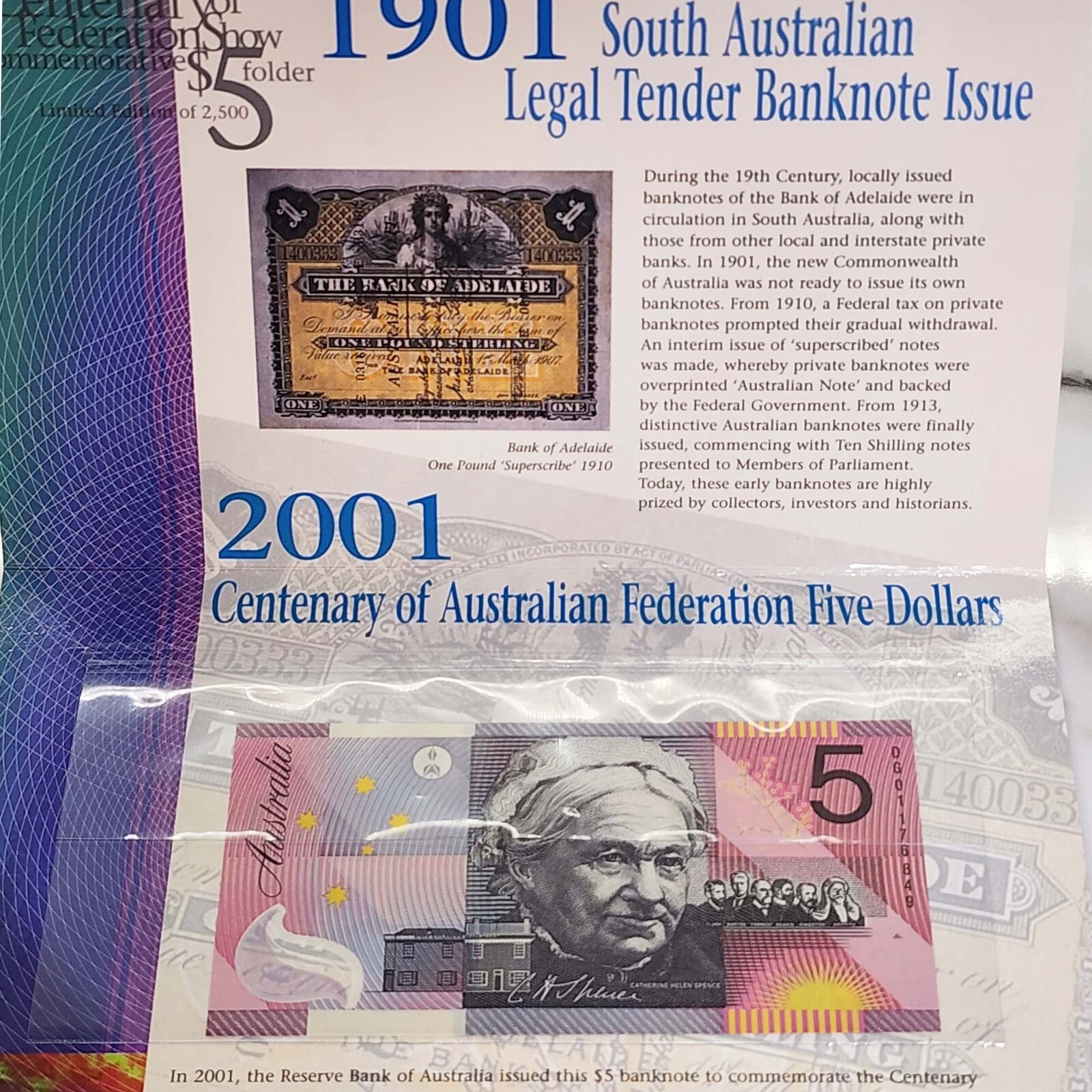 Australia 2001 Adelaide ANDA Show Federation Centenary $5 Banknote UNC in Folder