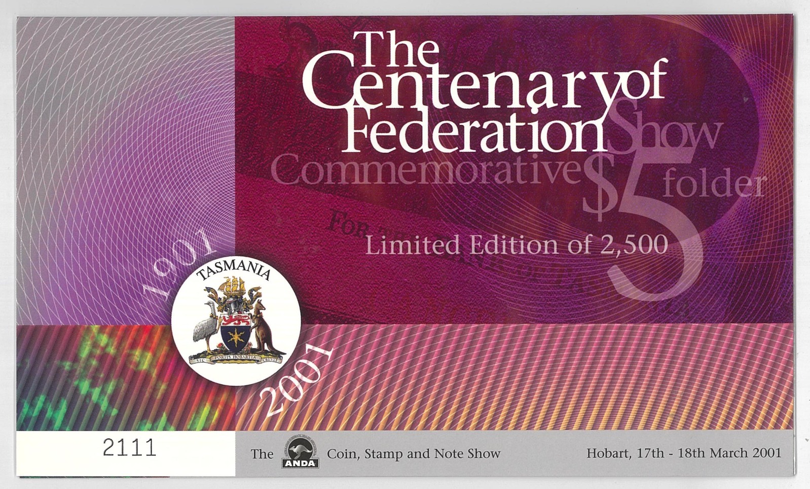 Australia 2001 Hobart ANDA Show Federation Centenary $5 Banknote UNC in Folder