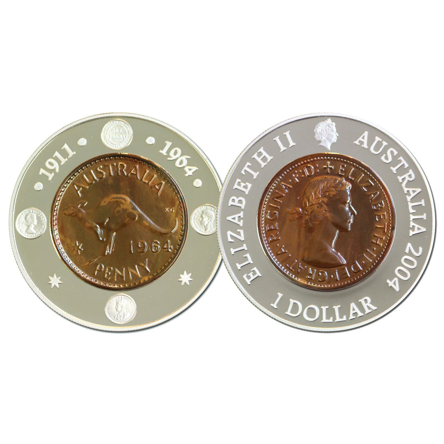 This $1 coin was released to commemorate the 40th anniversary of the final issue of Commonwealth Pre-Decimal Pennies in 1964. The reverse design shows four coin images surrounding a 1964 penny. They are the 1911 penny the first date of Australian Pennies and portraits of King George V, King George VI and Queen Elizabeth II.