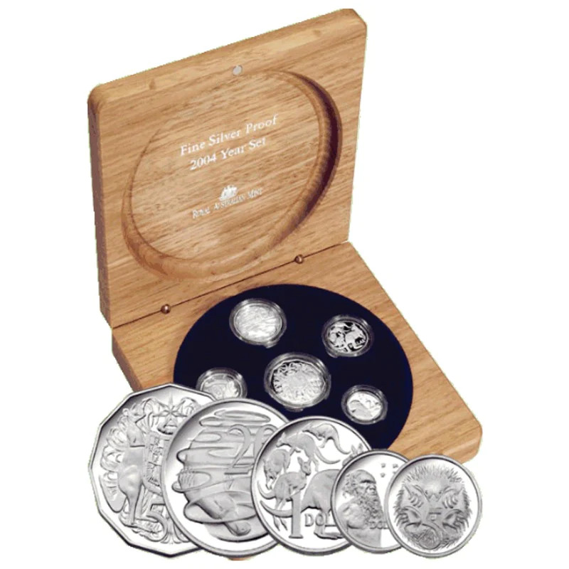 Struck by the Royal Australian Mint this 2004 6 coin fine silver proof set was struck with a small mintage of 6500 sets. Each set consists of 6 coins encapsulated and housed in a timber presentation box.
