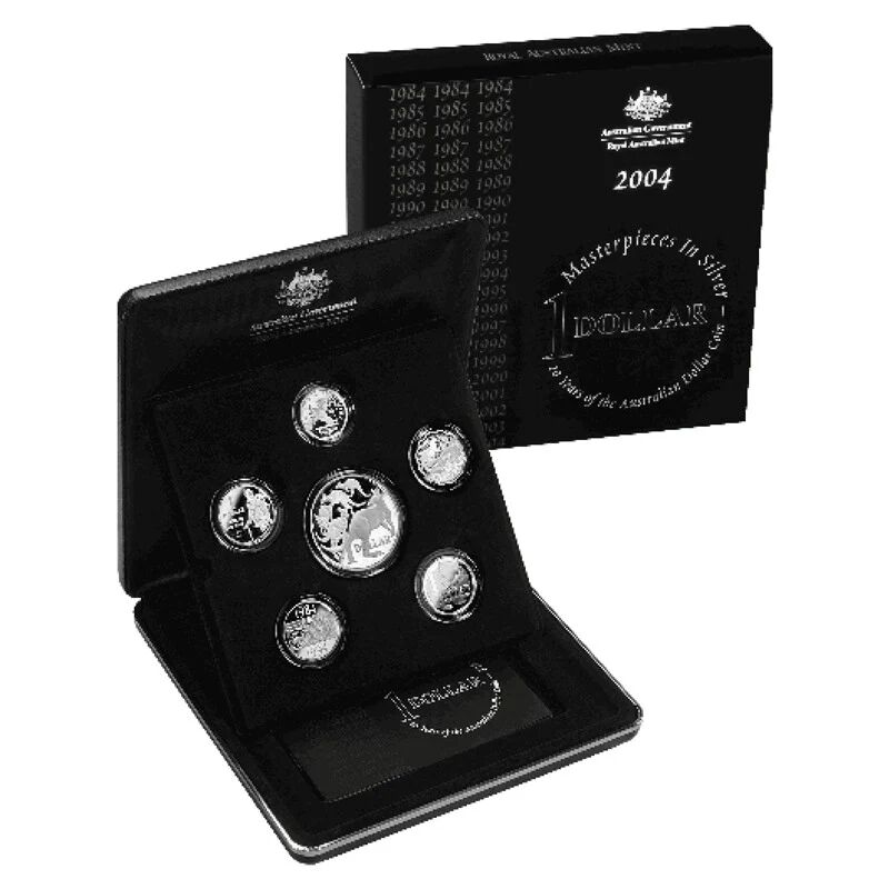 Australia 2004 Masterpieces in Silver containing six one dollar proof's commemorating the 20th anniversary (1984-2004) of the first one dollar coin. Second quality outer and inner box.