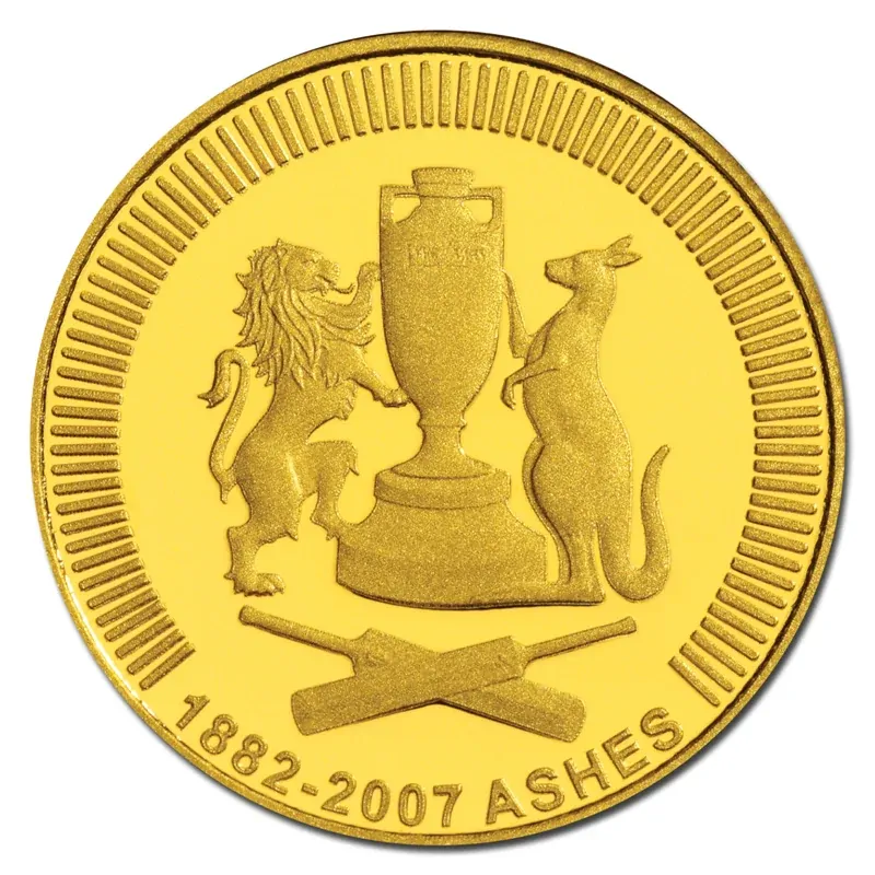 To celebrate the 2007 Ashes Series played in Australia the Royal Australian Mint struck a 1/10oz 99.99% Gold Proof featuring the Ashes urn flanked by lion & kangaroo - Design by Wojiciek Peitranik.