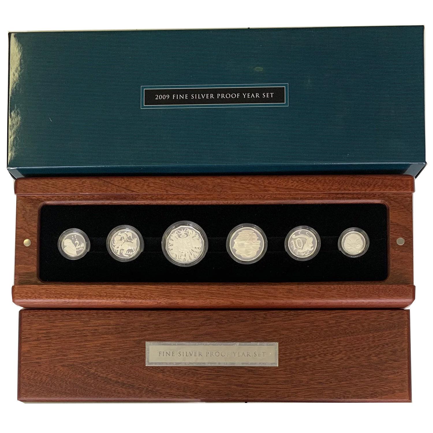 In 2009 the R.A.M issued all six coins in 99.9% pure silver. Struck to superb proof finish the 5¢ weighs 3.24grams 10¢ 6.57g 20¢ 13.36g 50¢ 18.24g $1 11.66g and $2 8.55g. Encapsulated and cased. Minor milk spots, second quality outer cardboard box.