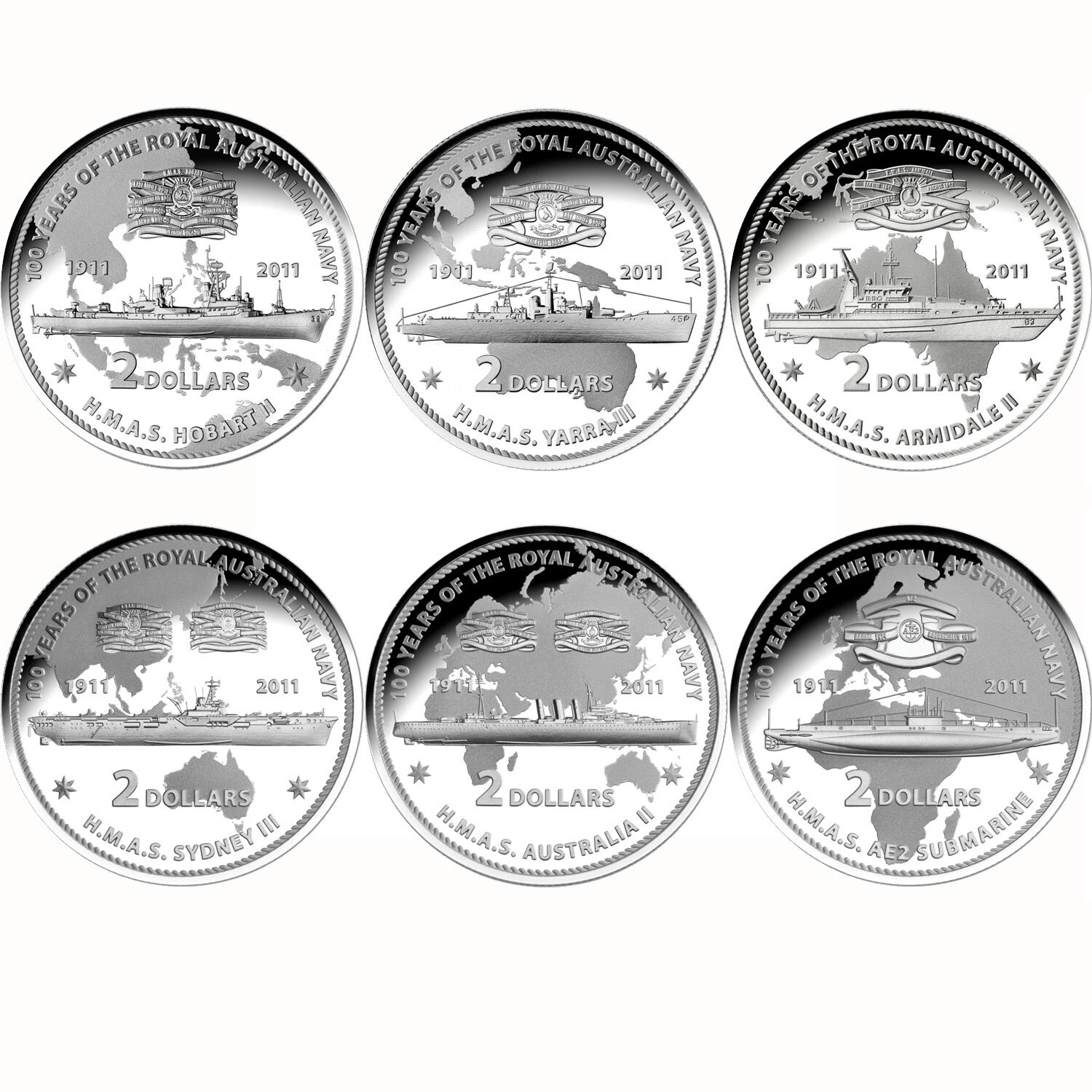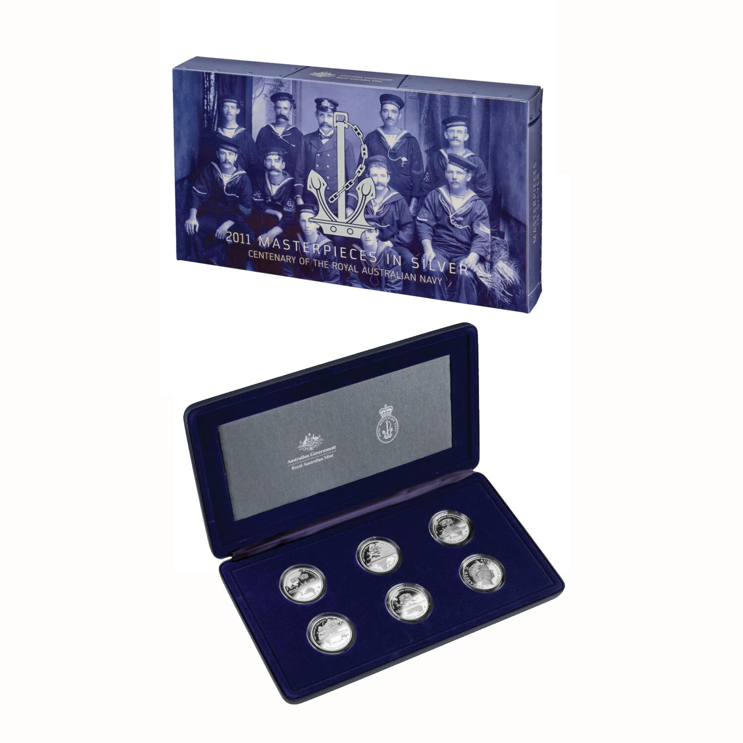 The Royal Australian Mint's 2011 Masterpieces in Silver set commemorated 100 years of the Royal Australian Navy (R.A.N.). The set consists of six proof sterling silver (.999 Fine) two dollar coins with reverse designs which pay tribute to six significant RAN ships which have defended the seas of Australia and our allies since 1911.