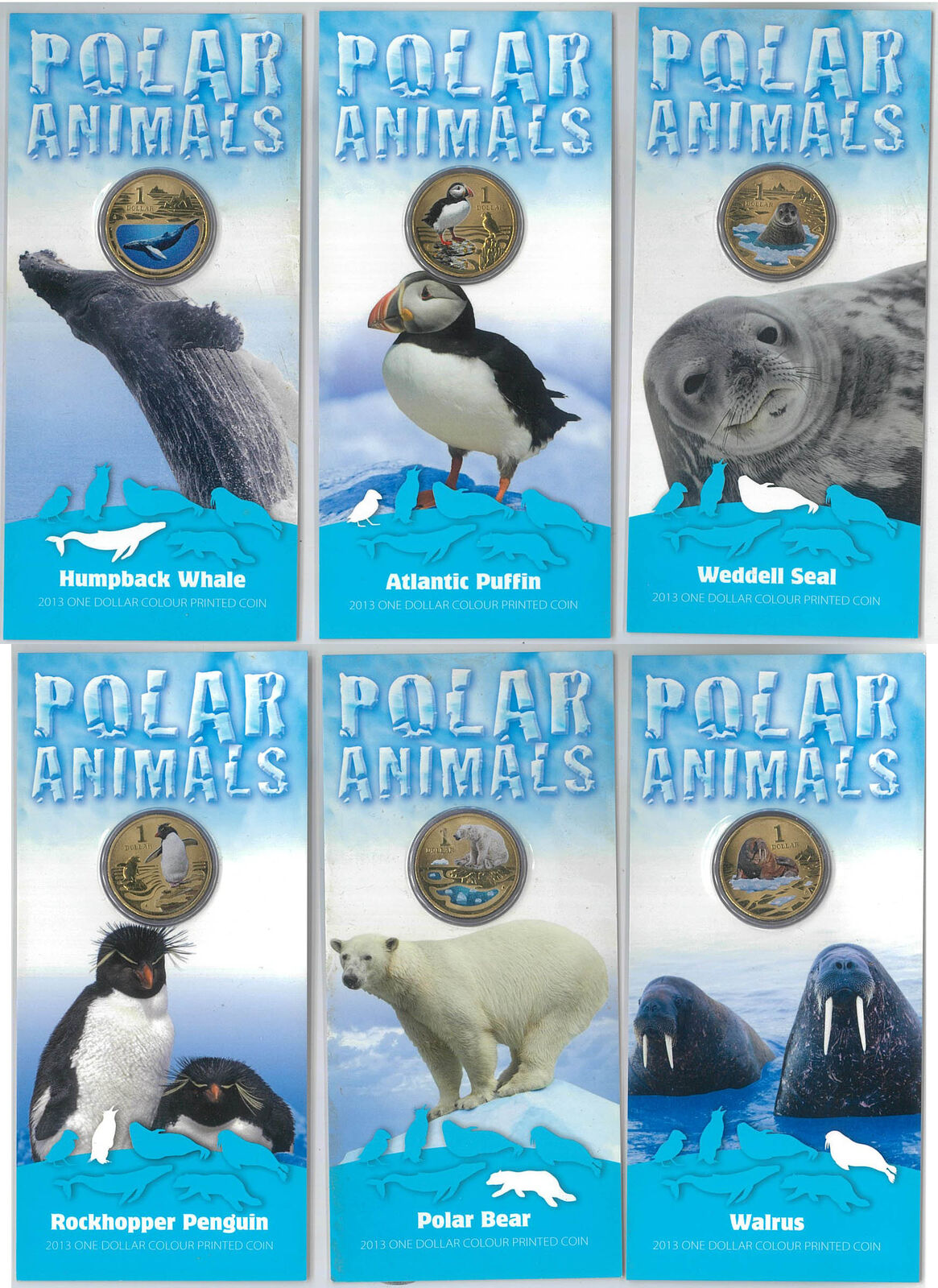 Australia 2013 Polar Animals Complete Set of 6 $1 Coloured UNC Coins in Cards