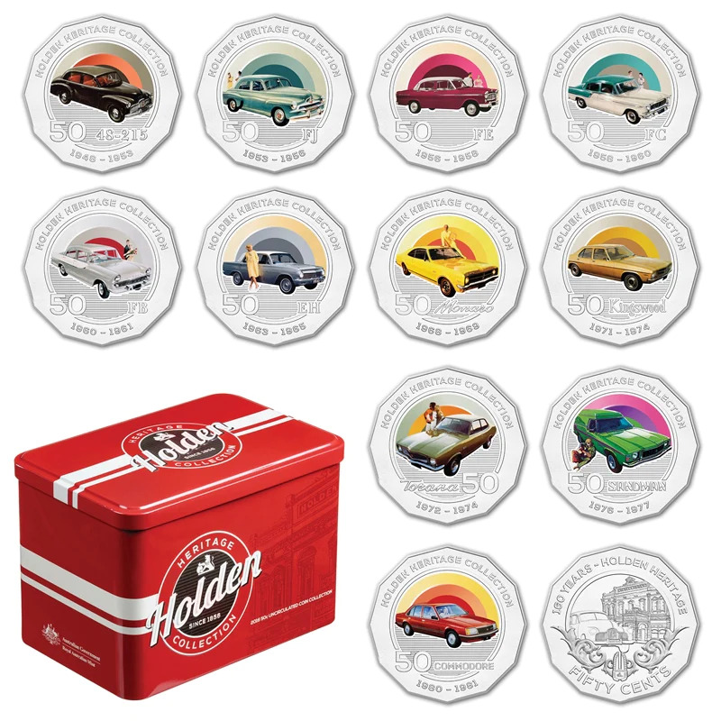 The Holden story began in 1856 when James Alexander Holden established J.A Holden & Co in Adelaide as a manufacturer of saddles and harnesses. In 1908 it moved into the automotive industry (with minor repairs and upholstry) starting up its first car engine in 1948. Commemorating 160 years of Holden in Australia the Royal Australian Mint has struck a 2016 cupro nickel uncirculated coloured 50 cents for eleven well-known models.