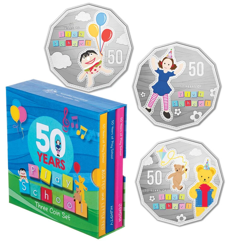 To celebrate 50 years of Australia’s most iconic children’s television program the Royal Australian Mint has designed a series of Play School themed coins. Featuring Jemima Humpty Big Ted and Little Ted the now famous Play School toys these coins will spark happy memories across generations.