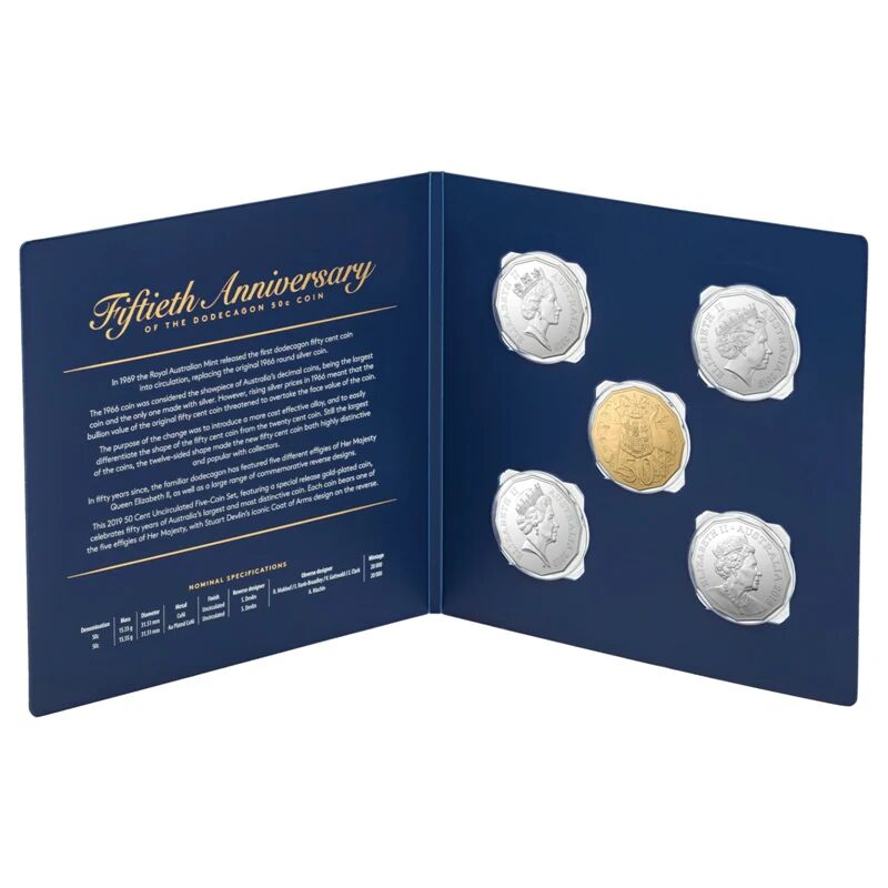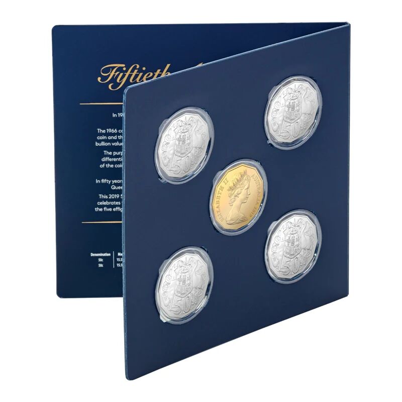 The 50th anniversary of the Royal Australian Mint's introduction of the copper-nickel dodecagonal 50¢ is celebrated in 2019 with this five coin 50¢ collection. The set marks the golden anniversary with a special release gold plated coin and celebrates the five different effigies of Her Majesty Queen Elizabeth II that have featured on the coins since 1969.