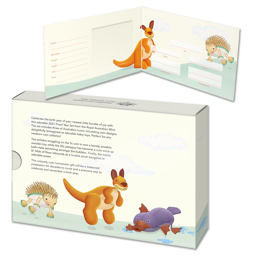 The Royal Australian Mint celebrates the arrival of your newest bundle of joy with its 2021 Proof Baby Coin Set. This uniquely and cutely numismatic set reimagines three of Australia’s distinct circulating coins as gorgeous baby toys.