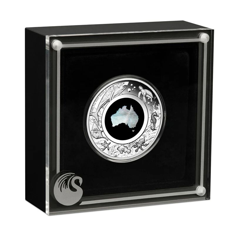 The design features a central mother of pearl insert in the shape of the Australian continent. It is encircled with representations of iconic marine creatures found in Australian waters, including a great white shark, sea turtle, seahorse, blue-ringed octopus, starfish and stingray. Included on the reverse is the coin’s weight, purity and year-date together with The Perth Mint’s ‘P’ mintmark.