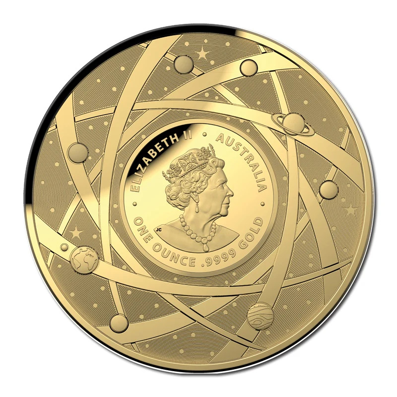 The 2021 $100 pure gold 1oz coin's reverse features a coloured image of the moons surface. Her Majesty Queen Elizabeth II features at centre on the obverse surrounded by the planets of our Solar System.