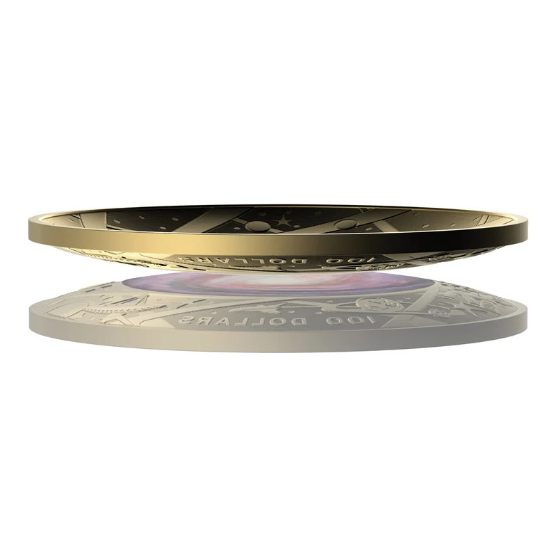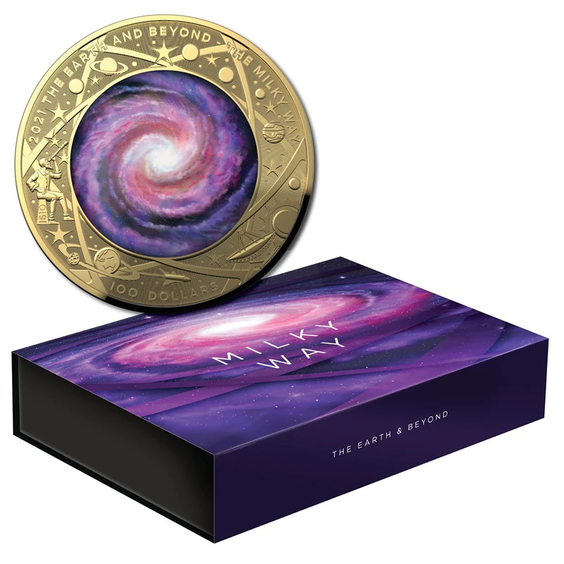 This stunning gold proof coin showcases the majesty of our galaxy - the Milky Way. Featuring a unique dome shape and cosmic colour print with limited mintage.