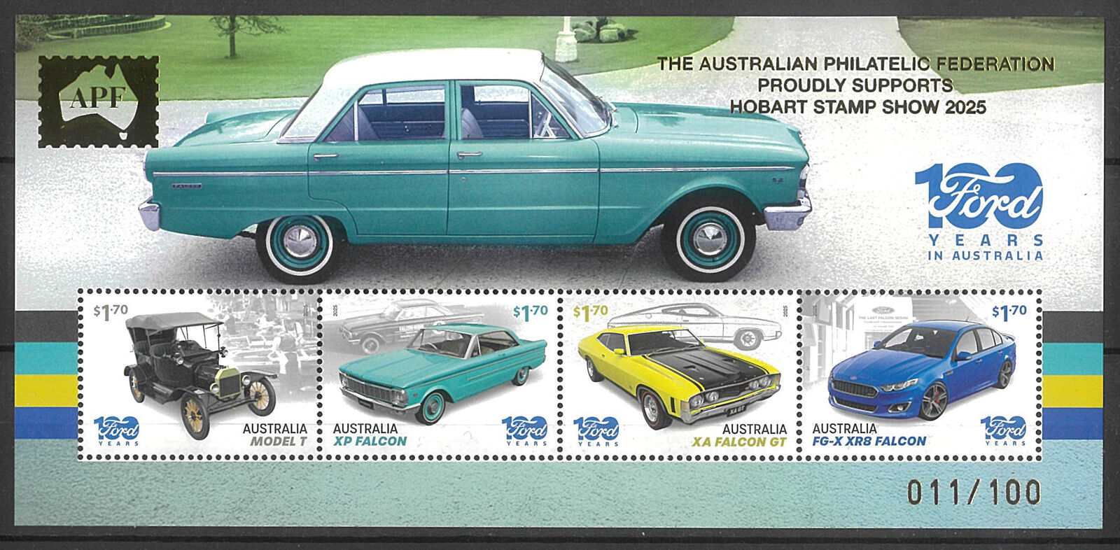 Australia 2025 Hobart Stamp Show - Ford 100 Years Ovpt Numbered Min Sheet MUH