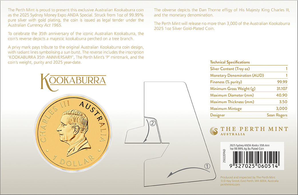The Perth Mint is proud to present this exclusive Sydney Money Expo Special the Australian Kookaburra 2025 1oz Silver Gold-Plated Coin.