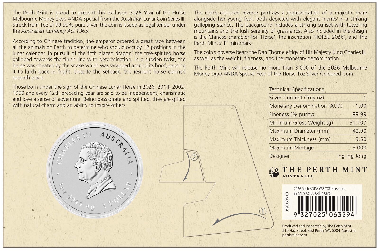The Perth Mint is proud to present this exclusive 2026 Melbourne Money Expo ANDA Special Year of the Horse 1oz