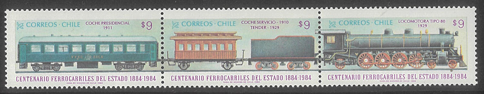 Chile 1984 Railways Anniversary/Trains Strip of 3 Stamps Scott 666 MUH 6-1