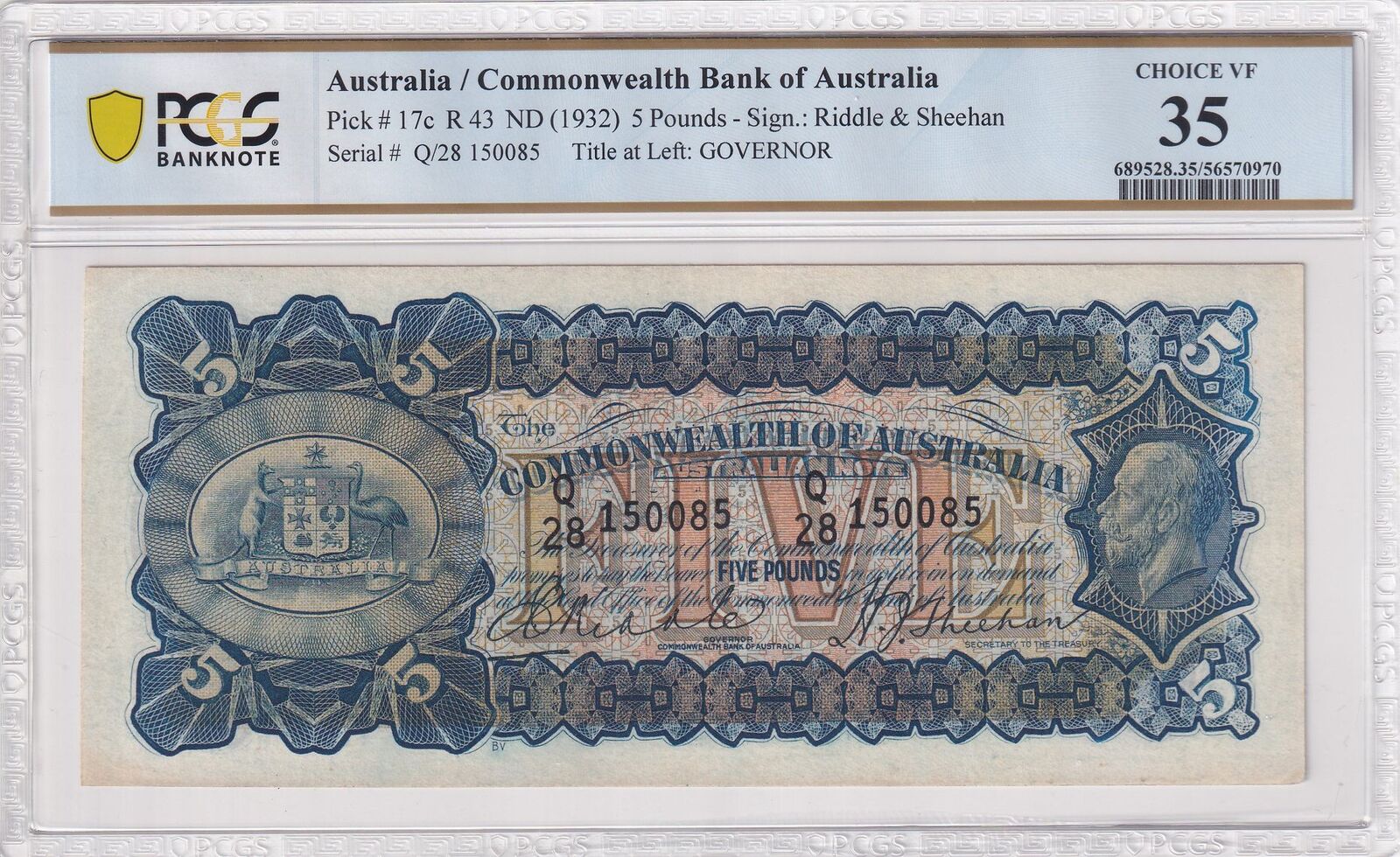 Commonwealth of Australia 1932 £5 Banknote Riddle/Sheehan R43 PCGS Choice VF35