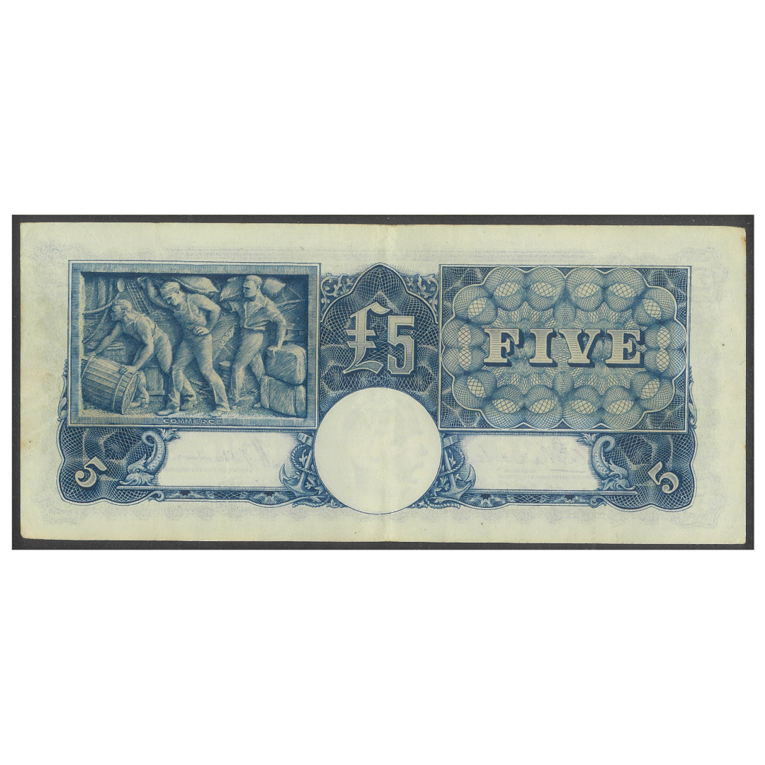 A visually arresting and historically significant note, this 1933 Five Pound issue features the rare pink face variant of King George V. In about Very Fine condition, it offers strong collector appeal and investment potential.