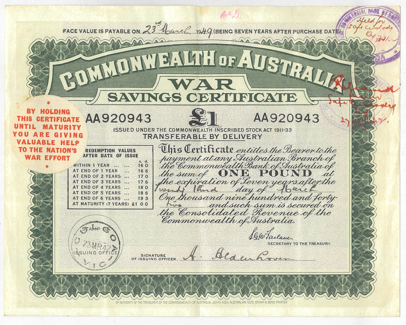 Historical Context: Australians were urged to purchase these certificates as both a patriotic duty and a practical savings measure. The funds raised contributed directly to wartime expenditures, while holders were promised repayment with interest after a fixed term.