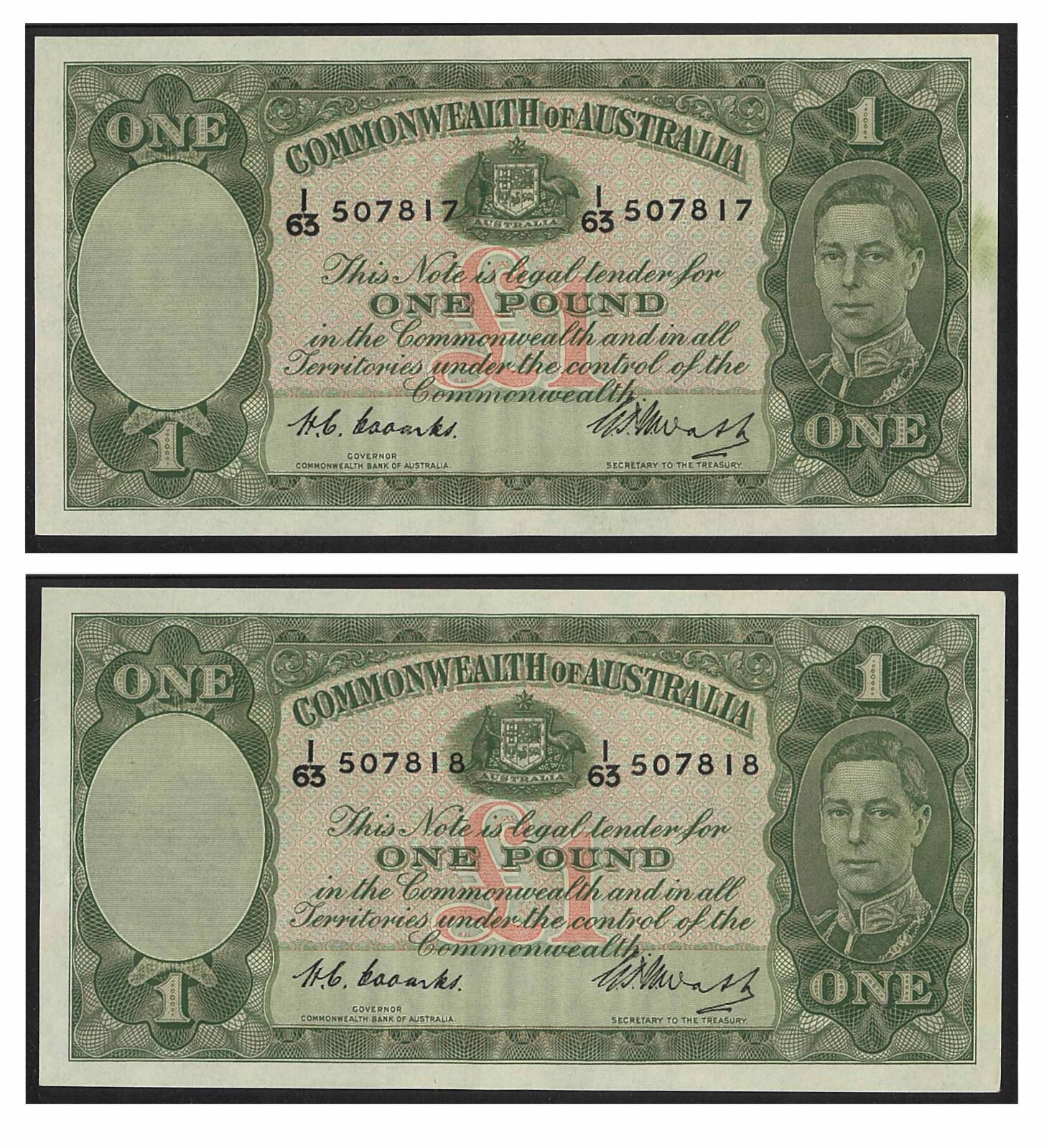 Commonwealth of Australia 1949 Coombs / Watt One Pound R31 EF Consecutive Pair
