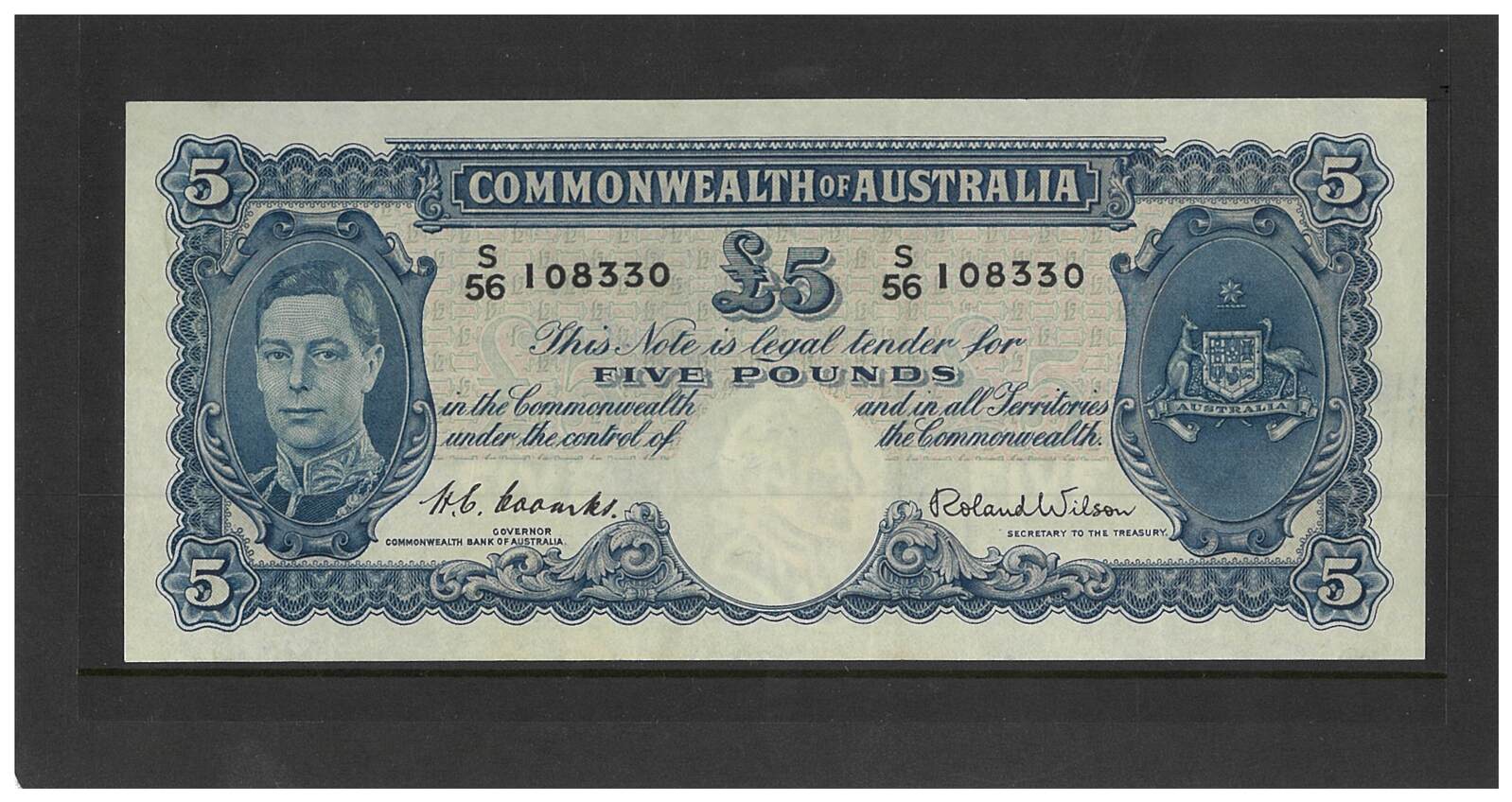 Commonwealth of Australia 1952 £5 Banknote Coombs/Wilson aEF/EF R48 (ink transfer) #P-28