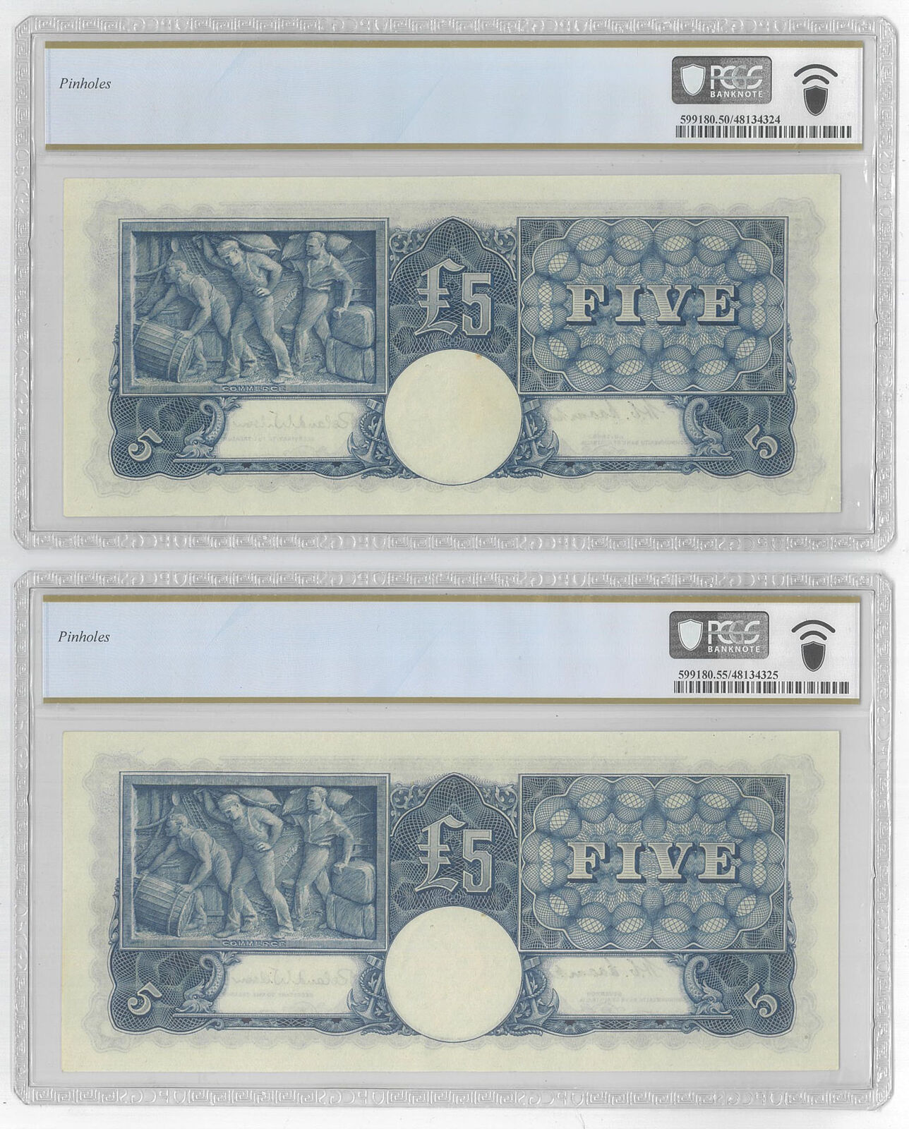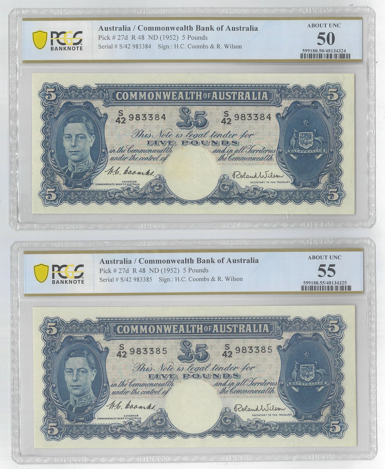 Commonwealth of Australia 1952 £5 Note Coombs/Wilson Consecutive Pair R48 PCGS aUNC P-27