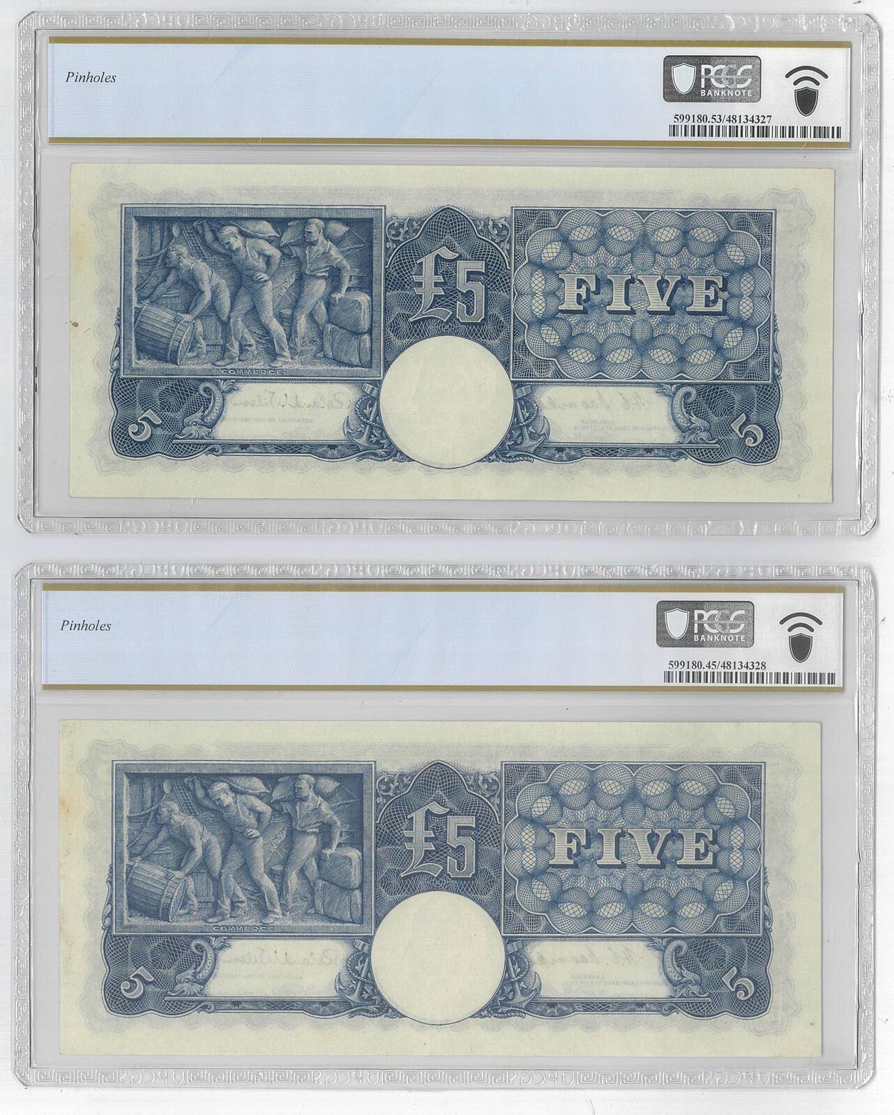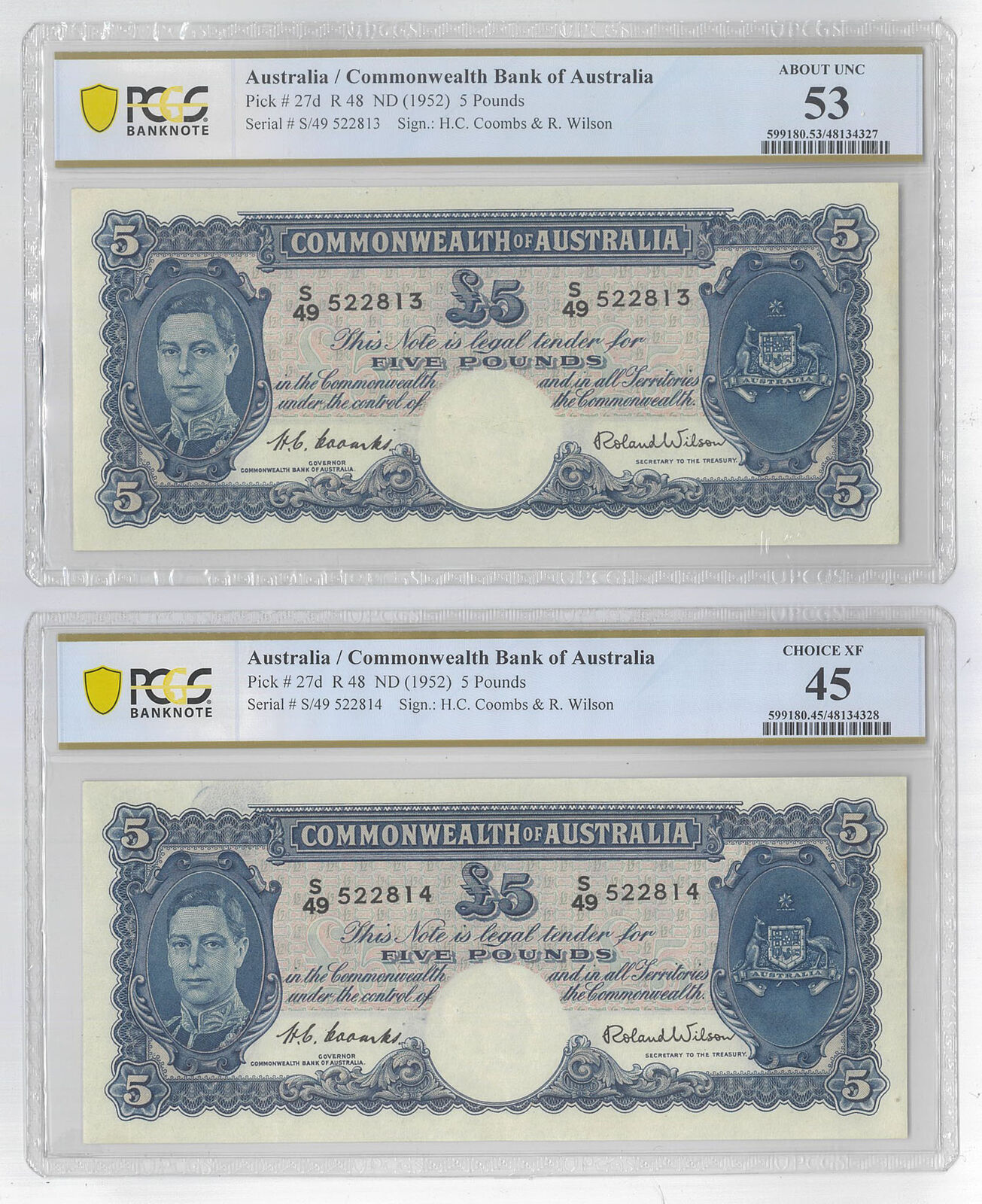 With Pinholes - Commonwealth of Australia 1952 £5 Note Coombs/Wilson Consecutive Pair R48 PCGS aUNC/XF P-31