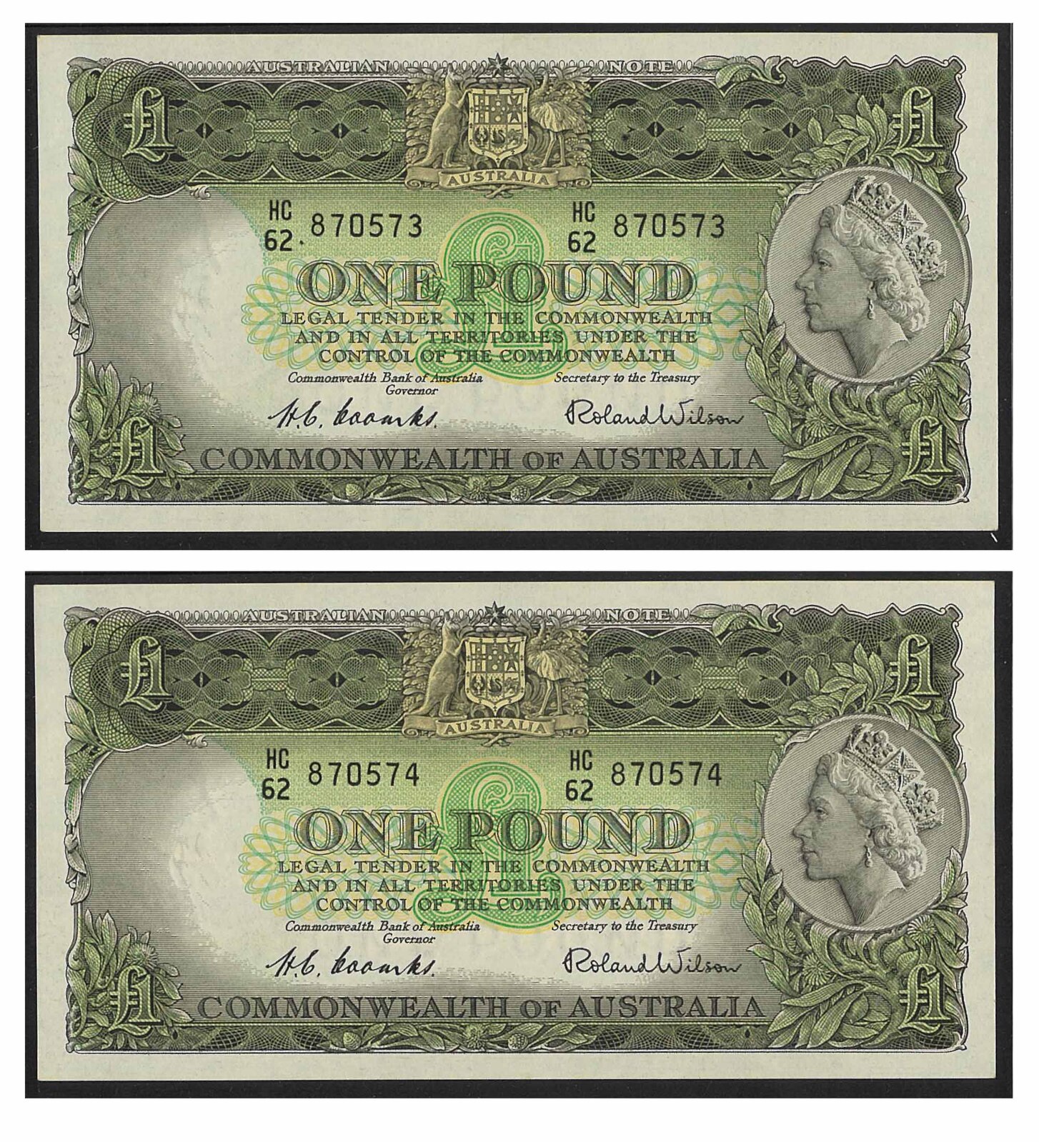 Commonwealth of Australia 1953 Coombs (CBA) / Wilson One Pound R33 UNC Consecutive Pair