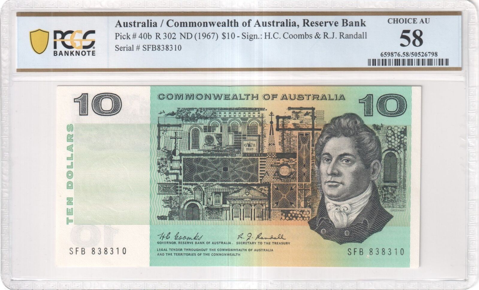 Commonwealth of Australia 1967 $10 Note Coombs/Randall R302 PCGS Choice AU 58