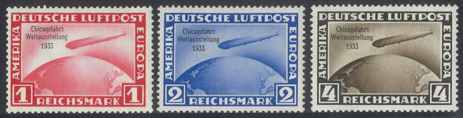 Germany 1933 Zeppelin Chicago Flight Set/3 Stamps Scott C43/45 Michel 496/98 Mint Hinged 31-7