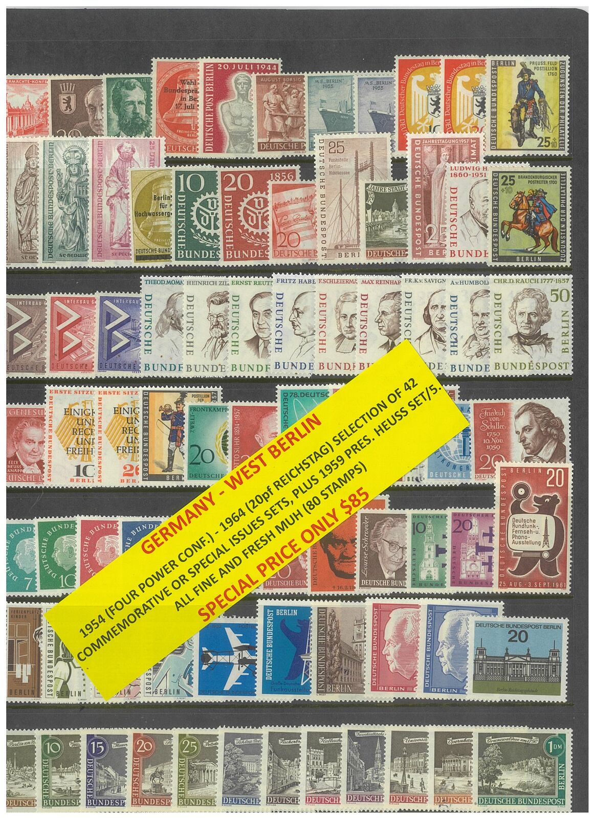 Germany West Berlin 1954 (Four Power Conference) - 1964 (20pf Reichstag) Selection of 42 Commemorative Sets, plus President Heuss set of 5. 80 Stamps MUH #405