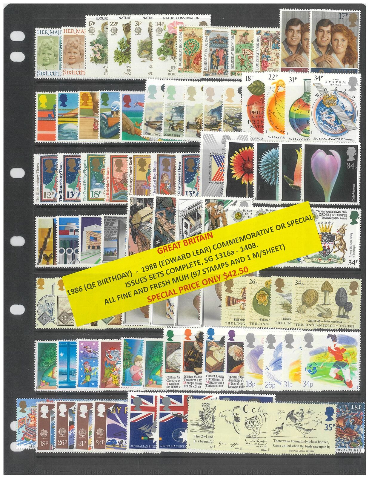 Great Britain 1986( QEII Birthday) - 1988 (Edward Lear) Commemorative Sets Complete SG1316a-1408, 97 Stamps & 1 Mini Sheet MUH