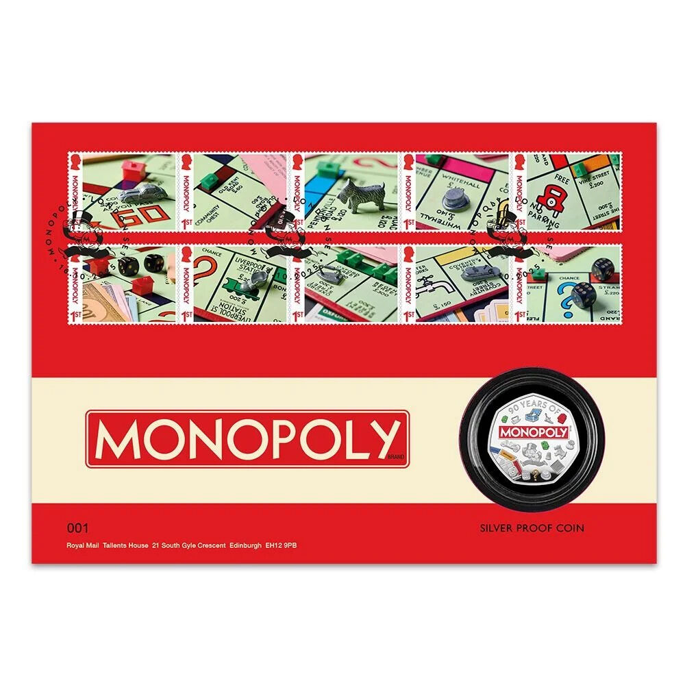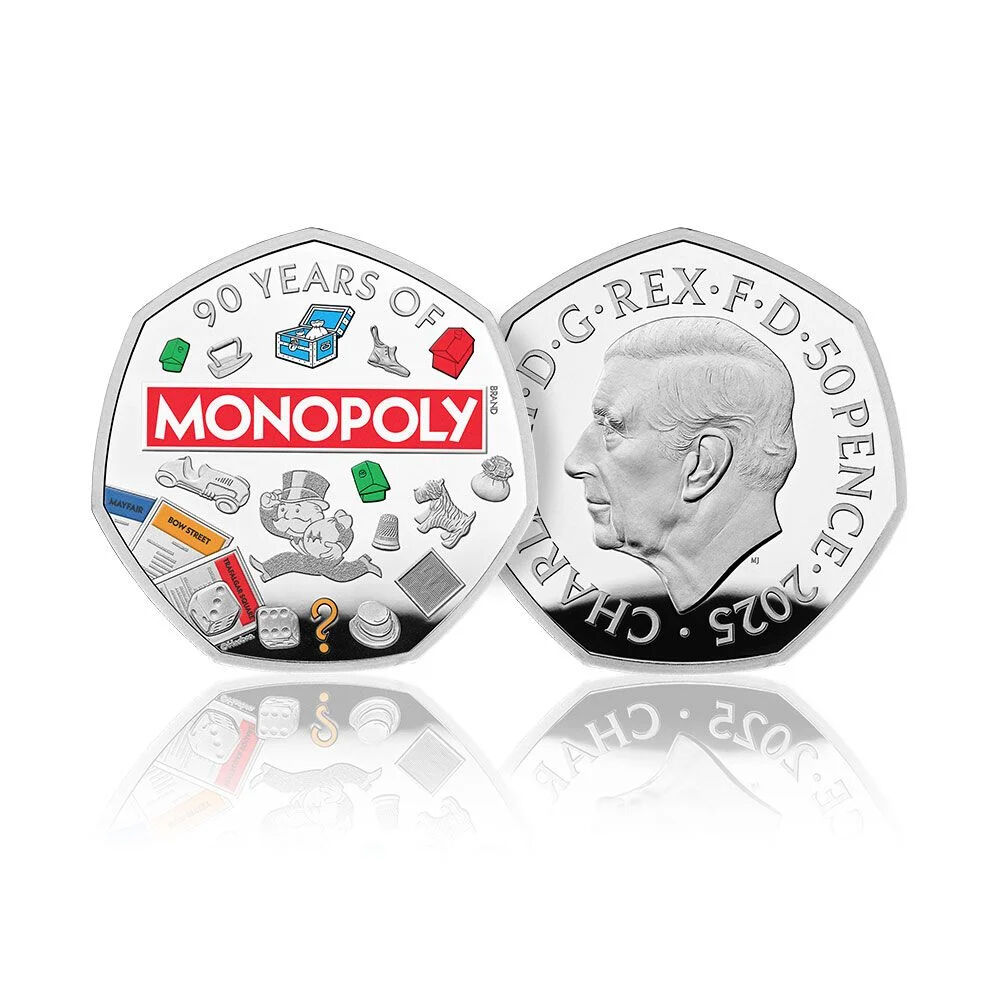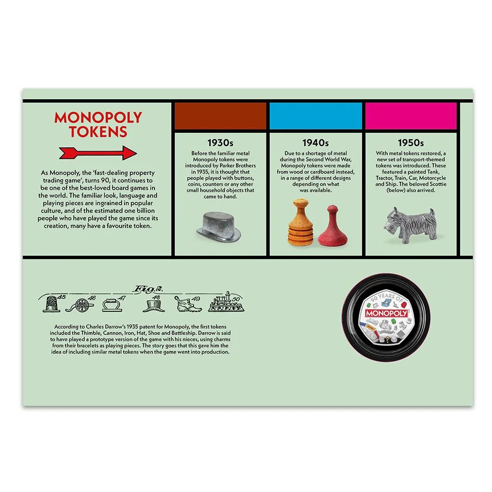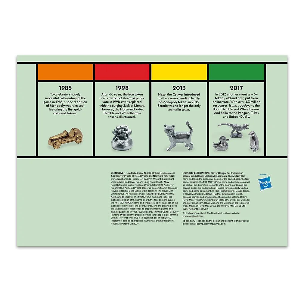 The commemorative 50p coin with colour features is struck from sterling silver using specially polished dies to achieve an exceptionally detailed and high-quality finish. The coin features playing tokens and Title Deed cards.