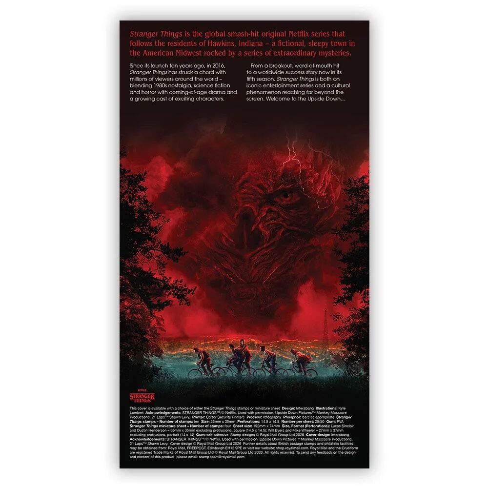 First Day Cover Miniature Sheet with four stamps featuring key characters Lucs, Will, Mike and Dustin, cancelled with the commemorative postmark.