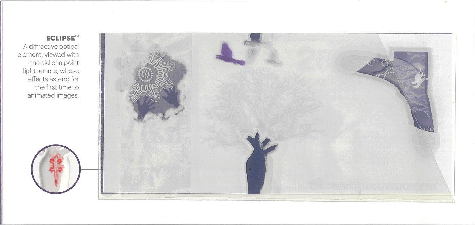 “Eclipse” Security Feature Displays Guardian’s dynamic Eclipse element, engineered to create shifting visual effects when tilted, enhancing both authentication and anti‑counterfeit performance.