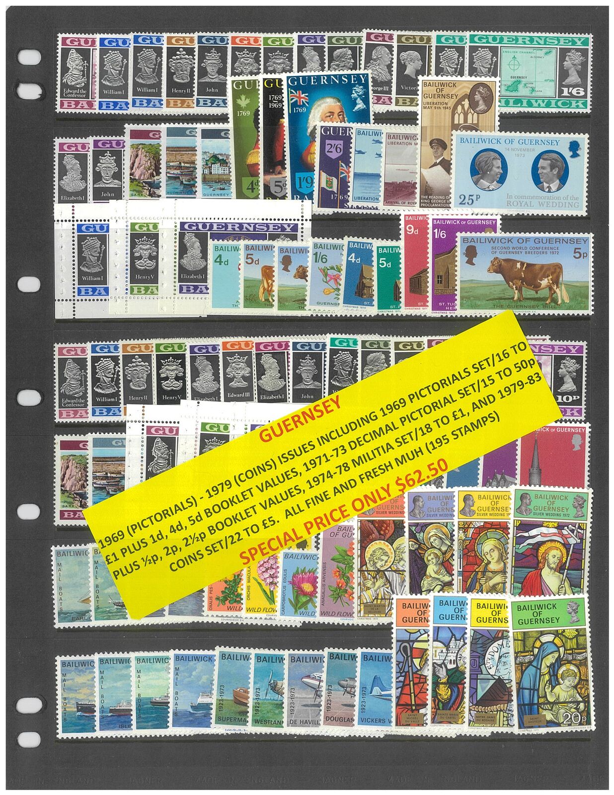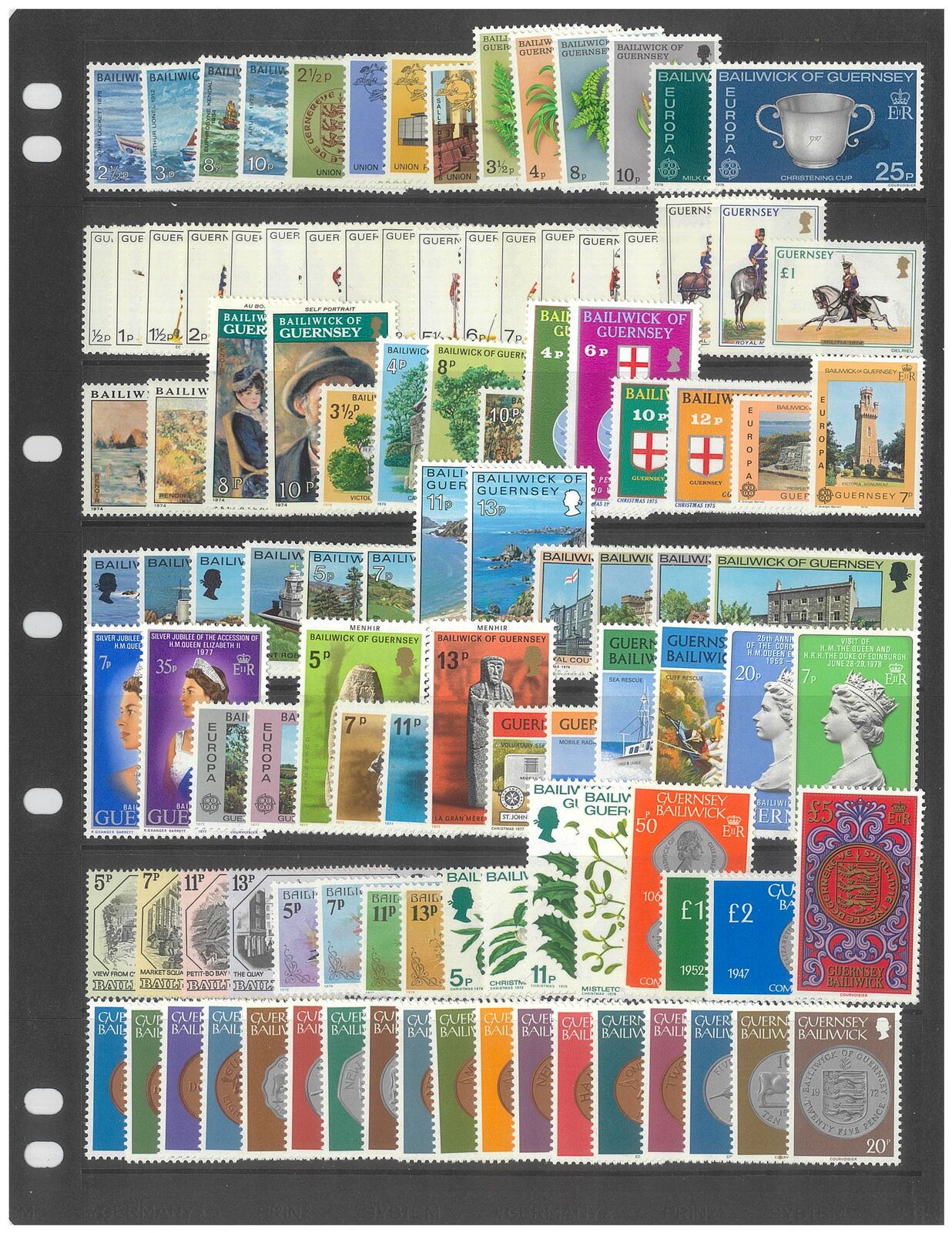 Guernsey 1969-79 Selection of 195 Stamps All Fine and Fresh MUH, including 1969 Pictorials set of 16 to £1 plus 1d, 4d 5d booklet values, 1971-1973 Decimal Pictorial set of 15 to 50p plus ½p, 2p, 2½p booklet values, 1974-1978 Militia set of 18 to £1, and 1979-83 Coins set of 22 to £5