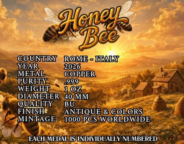 Italy 2026 Honey Bee 1oz Copper Medal - Antiqued and Coloured